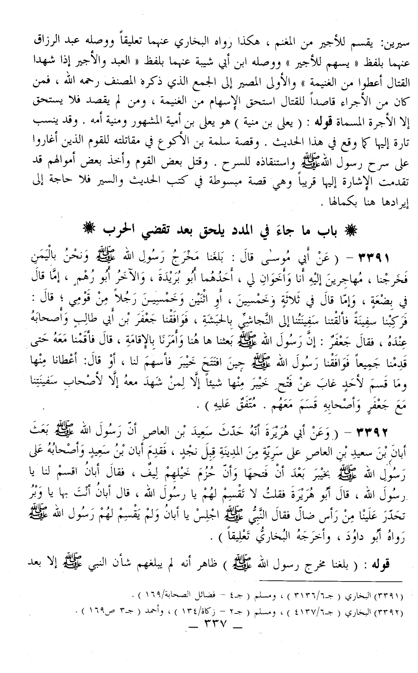 3392 - (وَعَنْ أَبِي هُرَيْرَةَ أَنَّهُ حَدَّثَ سَعِيدَ بْنِ الْعَاصِ «أَنَّ رَسُولَ اللَّهِ - صَلَّى اللَّهُ عَلَيْهِ وَسَلَّمَ - بَعَثَ أَبَانَ بْنَ سَعِيدِ بْن الْعَاصِ عَلَى سَرِيَّةٍ مِنْ الْمَدِينَةِ قِبَلَ نَجْدٍ، فَقَدِمَ أَبَانُ بْنُ سَعِيدٍ وَأَصْحَابُهُ عَلَى رَسُولِ اللَّهِ - صَلَّى اللَّهُ عَلَيْهِ وَسَلَّمَ - بِخَيْبَرَ بَعْدَ أَنْ فَتَحَهَا وَأَنَّ حُزُمَ خَيْلِهِمْ لِيفٌ، فَقَالَ أَبَانُ: اقْسِمْ لَنَا يَا رَسُولَ اللَّهِ، قَالَ أَبُو هُرَيْرَةَ: فَقُلْتُ: لَا تَقْسِمْ لَهُمْ يَا رَسُولَ اللَّهِ، قَالَ أَبَانُ: أَنْتَ بِهَا يَا وَبْرُ تَحَدَّرَ عَلَيْنَا مِنْ رَأْسِ ضَالٍّ. فَقَالَ النَّبِيُّ - صَلَّى اللَّهُ عَلَيْهِ وَسَلَّمَ -: اجْلِسْ يَا أَبَانُ وَلَمْ يَقْسِمْ لَهُمْ رَسُولُ اللَّهِ - صَلَّى اللَّهُ عَلَيْهِ وَسَلَّمَ -» . رَوَاهُ أَبُو دَاوُد، وَأَخْرَجَهُ الْبُخَارِيُّ تَعْلِيقًا) .