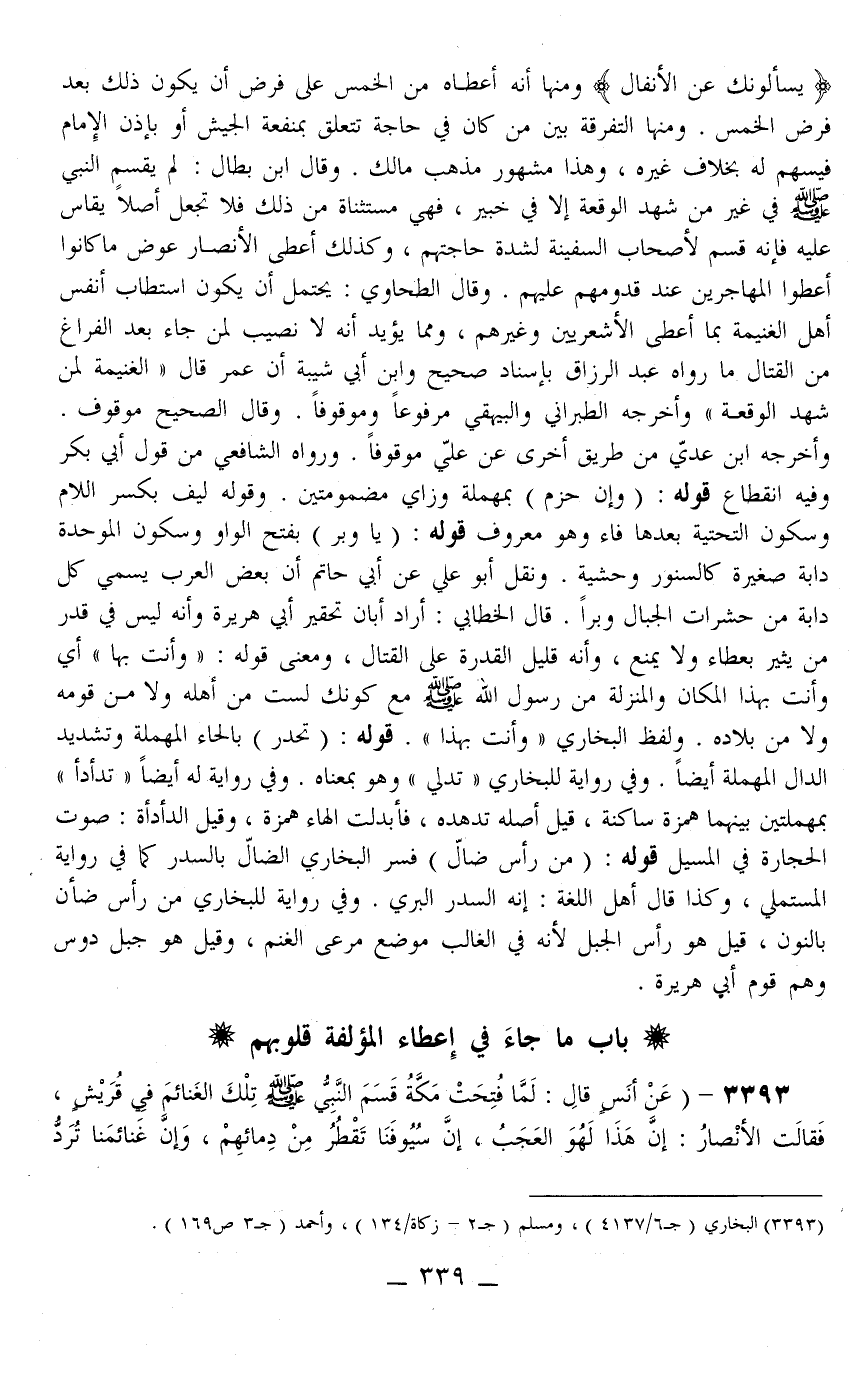 3393 - (عَنْ أَنَسٍ قَالَ: «لَمَّا فُتِحَتْ مَكَّةُ قَسَمَ النَّبِيُّ - صَلَّى اللَّهُ عَلَيْهِ وَسَلَّمَ - تِلْكَ الْغَنَائِمَ فِي قُرَيْشٍ، فَقَالَتْ الْأَنْصَارُ: إنَّ هَذَا لَهُوَ الْعَجَبُ، إنَّ سُيُوفَنَا تَقْطُرُ مِنْ دِمَائِهِمْ، وَإِنَّ غَنَائِمَنَا تُرَدُّ