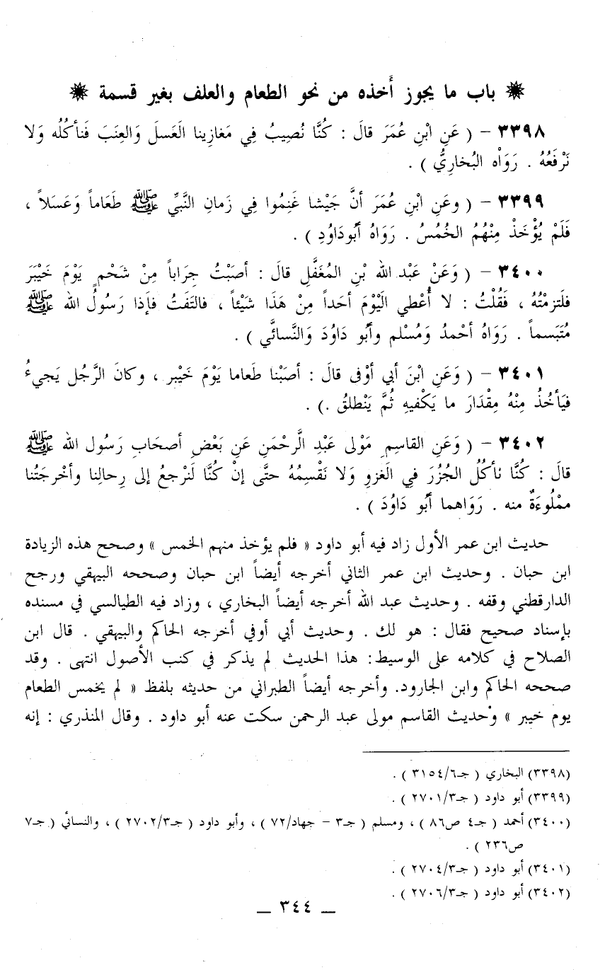 3399 - (وَعَنْ ابْنِ عُمَرَ «أَنَّ جَيْشًا غَنِمُوا فِي زَمَانِ النَّبِيِّ - صَلَّى اللَّهُ عَلَيْهِ وَسَلَّمَ - طَعَامًا وَعَسَلًا، فَلَمْ يُؤْخَذْ مِنْهُمْ الْخُمُسُ» . رَوَاهُ أَبُو دَاوُد) .