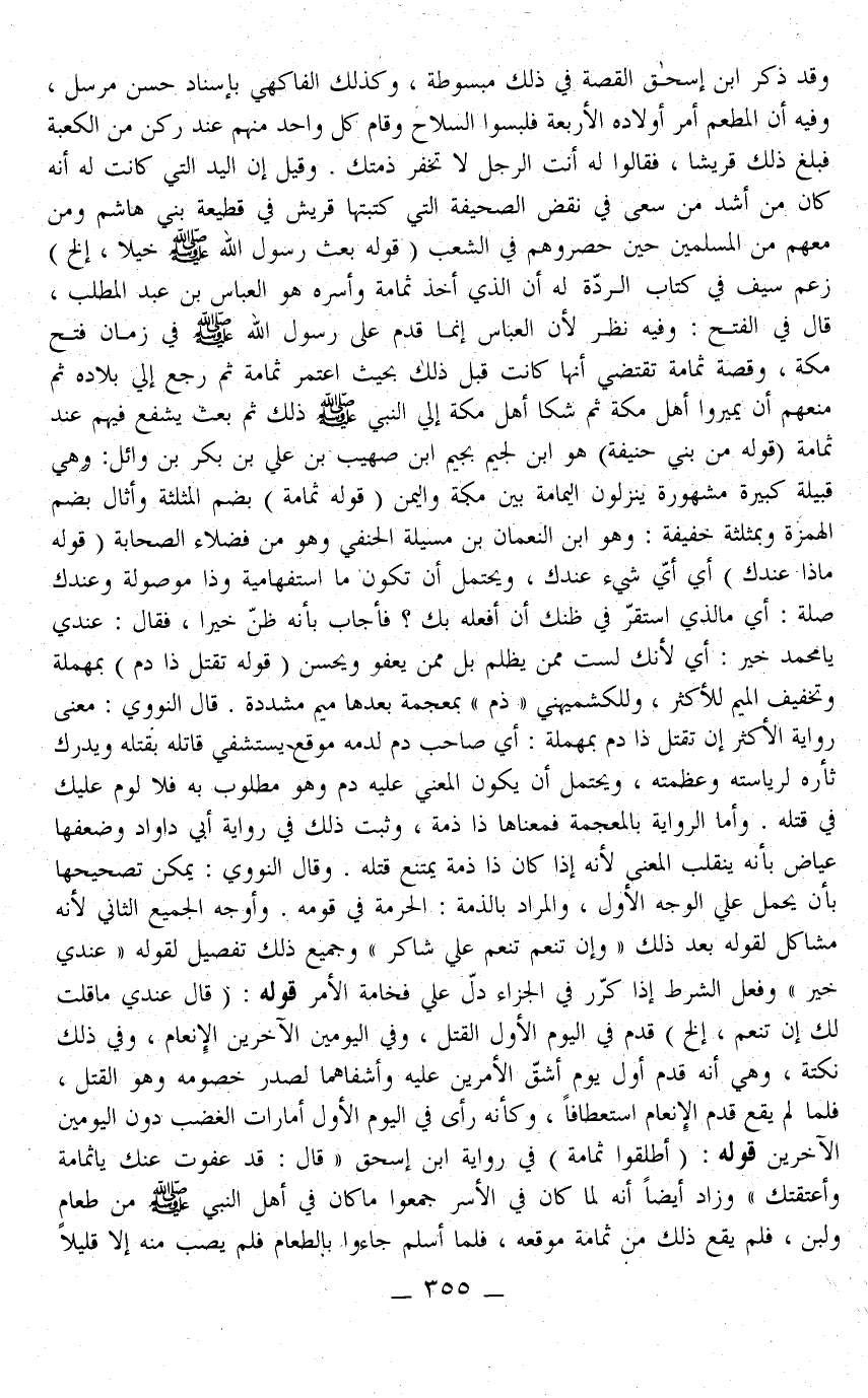 وَقَالَ النَّوَوِيُّ: يُمْكِنُ تَصْحِيحُهَا بِأَنْ يُحْمَلَ عَلَى الْوَجْهِ الْأَوَّلِ، وَالْمُرَادُ بِالذِّمَّةِ: الْحُرْمَةُ فِي قَوْمِهِ. وَأَوْجَهُ الْجَمِيعِ الثَّانِي لِأَنَّهُ مُشَاكِلٌ لِقَوْلِهِ بَعْدَ ذَلِكَ " وَإِنْ تُنْعِمْ تُنْعِمْ عَلَى شَاكِرٍ " وَجَمِيعُ ذَلِكَ تَفْصِيلٌ لِقَوْلِهِ " عِنْدِي خَيْرٌ " وَفِعْلُ الشَّرْطِ إذَا كُرِّرَ فِي الْجَزَاءِ دَلَّ عَلَى فَخَامَةِ الْأَمْرِ، قَوْلُهُ: (قَالَ عِنْدِي مَا قُلْت لَك: إنْ تُنْعِمْ. . . إلَخْ) قَدَّمَ فِي الْيَوْمِ الْأَوَّلِ الْقَتْلَ، وَفِي الْيَوْمَيْنِ الْآخَرِينَ الْإِنْعَامَ، وَفِي ذَلِكَ نُكْتَةٌ، وَهِيَ أَنَّهُ قَدَّمَ أَوَّلَ يَوْمٍ أَشَقَّ الْأَمْرَيْنِ عَلَيْهِ وَأَشْفَاهُمَا لِصَدْرِ خُصُومِهِ وَهُوَ الْقَتْلُ، فَلَمَّا لَمْ يَقَعْ قَدَّمَ الْإِنْعَامَ اسْتِعْطَافًا، وَكَأَنَّهُ رَأَى فِي الْيَوْمِ الْأَوَّلِ أَمَارَاتِ الْغَضَبِ دُونَ الْيَوْمَيْنِ الْآخَرِينَ قَوْلُهُ: (أَطْلِقُوا ثُمَامَةَ) فِي رِوَايَةِ ابْنِ إِسْحَاقَ " قَالَ: قَدْ عَفَوْتُ عَنْكَ يَا ثُمَامَةُ وَأَعْتَقْتُكَ " وَزَادَ أَيْضًا أَنَّهُ لَمَّا كَانَ فِي الْأَسْرِ جَمَعُوا مَا كَانَ فِي أَهْلِ النَّبِيِّ - صَلَّى اللَّهُ عَلَيْهِ وَسَلَّمَ - مِنْ طَعَامٍ وَلَبَنٍ، فَلَمْ يَقَعْ ذَلِكَ مِنْ ثُمَامَةَ مَوْقِعَهُ، فَلَمَّا أَسْلَمَ جَاءُوا بِالطَّعَامِ فَلَمْ يُصِبْ مِنْهُ إلَّا قَلِيلًا