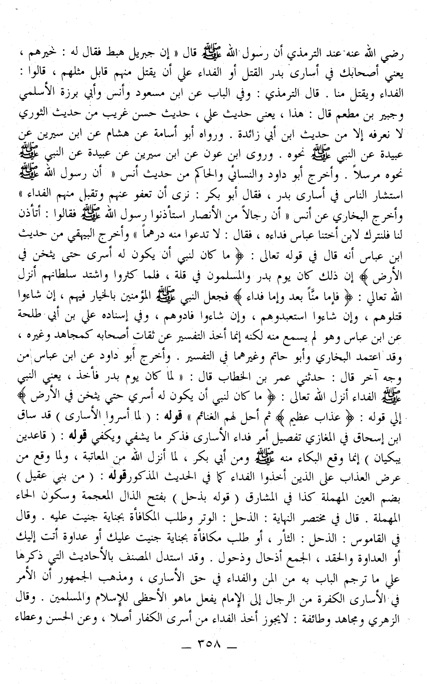 وَأَخْرَجَ أَبُو دَاوُد عَنْ ابْنِ عَبَّاسٍ مِنْ وَجْهٍ آخَرَ قَالَ: حَدَّثَنِي عُمَرُ بْنُ الْخَطَّابِ قَالَ: «لَمَّا كَانَ يَوْمُ بَدْرٍ فَأَخَذَ، يَعْنِي النَّبِيَّ - صَلَّى اللَّهُ عَلَيْهِ وَسَلَّمَ - الْفِدَاءَ أَنْزَلَ اللَّهُ تَعَالَى: {مَا كَانَ لِنَبِيٍّ أَنْ يَكُونَ لَهُ أَسْرَى حَتَّى يُثْخِنَ فِي الأَرْضِ} [الأنفال: 67] إلَى قَوْلِهِ: {عَذَابٌ عَظِيمٌ} [الأنفال: 68] ثُمَّ أَحَلَّ لَهُمْ الْغَنَائِمَ» قَوْلُهُ: (لَمَّا أَسَرُوا الْأُسَارَى) قَدْ سَاقَ ابْنُ إِسْحَاقَ فِي الْمَغَازِي تَفْصِيلَ أَمْرِ فِدَاءِ الْأُسَارَى فَذَكَرَ مَا يَشْفِي وَيَكْفِي قَوْلُهُ: (قَاعِدَيْنِ يَبْكِيَانِ) إنَّمَا وَقَعَ الْبُكَاءُ مِنْهُ - صَلَّى اللَّهُ عَلَيْهِ وَسَلَّمَ - وَمِنْ أَبِي بَكْرٍ، لِمَا أَنْزَلَ اللَّهُ مِنْ الْمُعَاتَبَةِ، وَلِمَا وَقَعَ مِنْ عَرْضِ الْعَذَابِ عَلَى الَّذِينَ أَخَذُوا الْفِدَاءَ كَمَا فِي الْحَدِيثِ الْمَذْكُورِ قَوْلُهُ: (مِنْ بَنِي عُقَيْلٍ) بِضَمِّ الْعَيْنِ الْمُهْمَلَةِ كَذَا فِي الْمَشَارِقِ (قَوْلُهُ بِذَحْلِ) بِفَتْحِ الذَّالِ الْمُعْجَمَةِ وَسُكُونِ الْحَاءِ الْمُهْمَلَةِ.