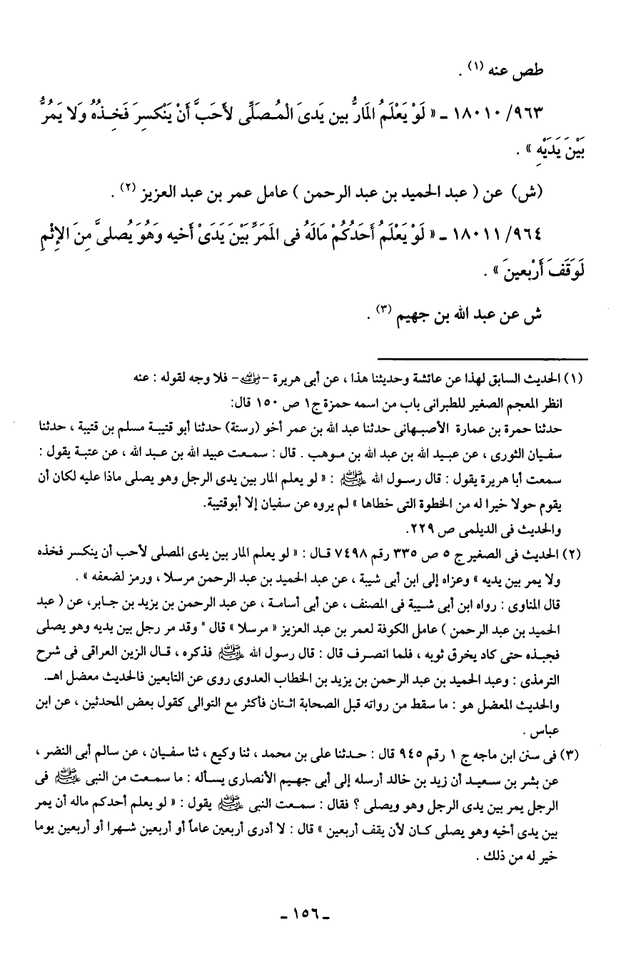 (¬3) في سنن ابن ماجه ج 1 رقم 945 قال: حدثنا علي بن محمد، ثنا وكيع، ثنا سفيان، عن سالم أبي النضر، عن بشر بن سعيد أن زيد بن خالد أرسله إلى أبي جهيم الأنصاري يسأله: ما سمعت من النبي - صلى الله عليه وسلم - في الرجل يمر بين يدي الرجل وهو ويصلى؟ فقال: سمعت النبي - صلى الله عليه وسلم - يقول "لو يعلم أحدكم ما له أن يمر بين يدي أخيه وهو يصلى كان لأن يقف أربعين" قال: لا أدرى أربعين عاما أو أربعين شهرا أو أربعين يوما خير له من ذلك.