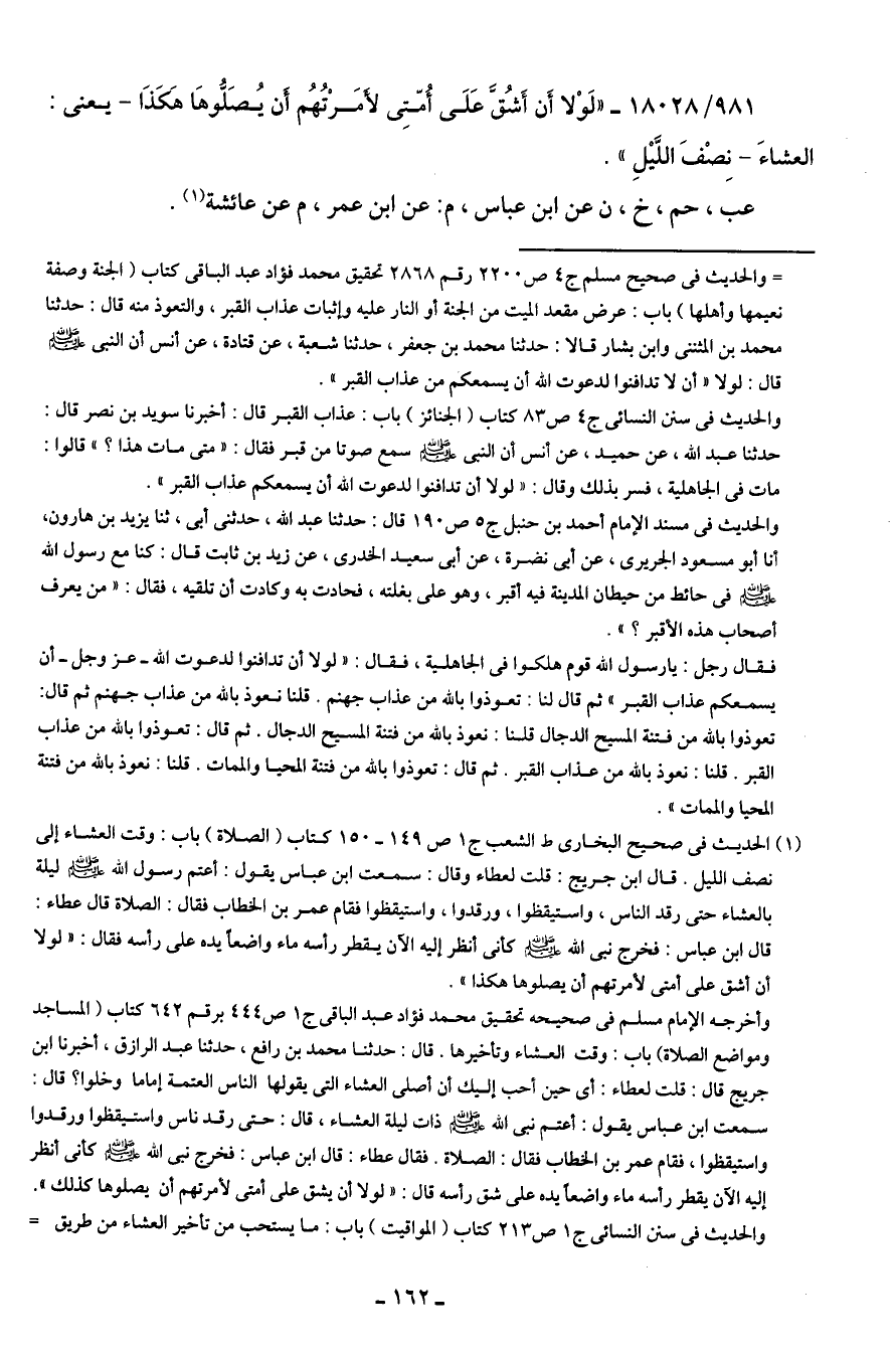 981/ 18028 - "لَوْلا أَن أَشُقَّ عَلَى أُمّتِى لأمَرْتُهُم أن يُصَلُّوهَا هَكَذَا -يعني: العشاءَ- نِصْفَ اللَّيلِ".