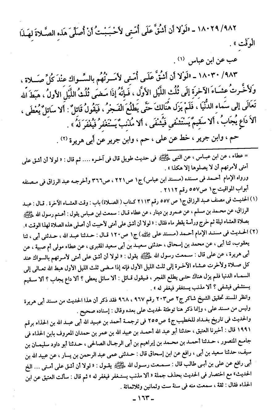 983/ 18030 - "لَوْلا أن أشُقَّ عَلَى أمّتِى لأمَرْتُهُم بالسِّواك عِنْدَ كُلِّ صَلاة، وَلأخَّرتُ عِشَاءَ الآَخِرَةِ إلَى ثُلُثِ اللَّيل الأوَّل، فَإِنَّهُ إذَا مَضَى ثُلُثُ اللَيلِ الأولُ، هَبَطَ الله تَعَالى إلى سَماء الدُّنْيَا، فَلَمْ يَزَل هُنَالِكَ حَتَّى يطلُعَ الفَجْرُ، فَيَقُولُ قَائِلٌ: ألا سَائِلٌ يُعْطَى، ألا دَاعٍ يُجَابُ، ألا سَقِيمٌ يَسْتَشْفي فَيُشْفَى، ألا مُذْنِبٌ يَسْتَغْفِرُ فَيُغْفَرَ لَهُ".