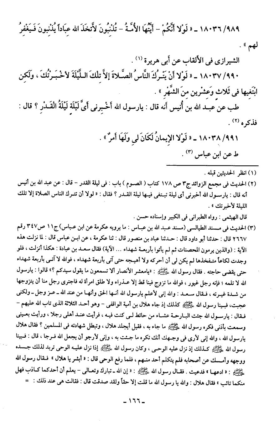 990/ 18037 - "لَوْلا أنْ يَتْرُكَ النَّاسُ الصَّلاةَ إلَّا تِلكَ اللَّيلَةَ لأخْبَرْتُكَ، وَلَكِن ابْتَغِيها في ثَلاث وَعِشرين مِنَ الشَّهْرِ".