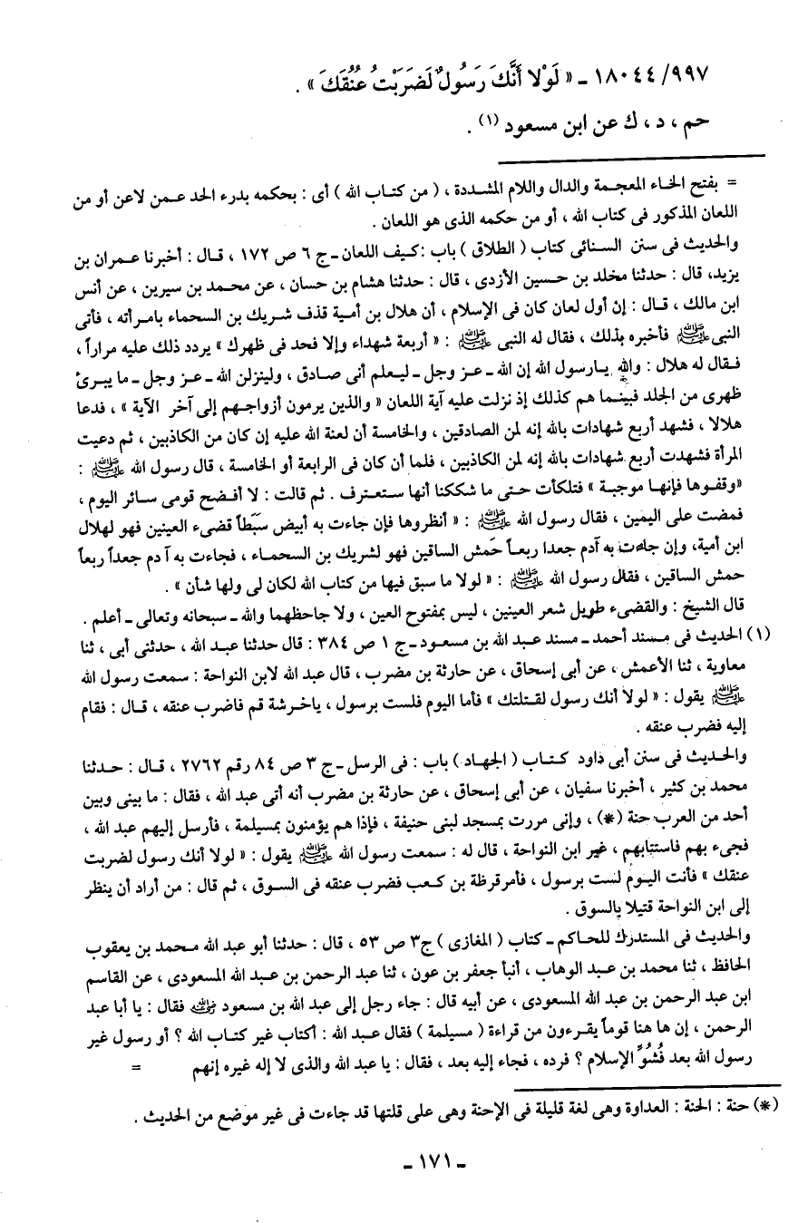 (¬1) الحديث في مسند أحمد- مسند عبد الله بن مسعود- ج 1 ص 384: قال حدثنا عبد الله، حدثني أبي، ثنا - صلى الله عليه وسلم -، ثنا الأعمش، عن أبي إسحاق، عن حارثة بن مضرب، قال عبد الله لابن النواحة: سمعت رسول الله - صلى الله عليه وسلم - يقول: "لولا أنك رسول لقتلتك" فأما اليوم فلست برسول، يا خرشة قم فاضرب عنقه، قال: فقام إليه فضرب عنقه.
