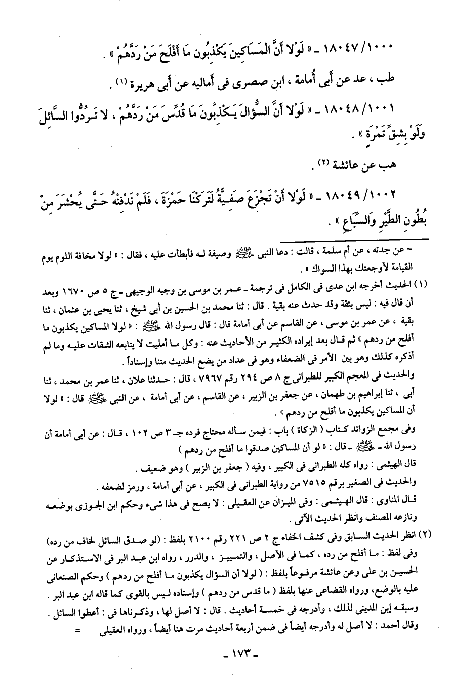 1001/ 18048 - "لَوْلا أَنَّ السُّؤال يَكْذِبُونَ مَا قُدِّسَ مَنْ رَدَّهُمْ، لا تَرُدُّوا السَّائِلَ وَلَوْ بِشِقِّ تَمْرَةٍ".