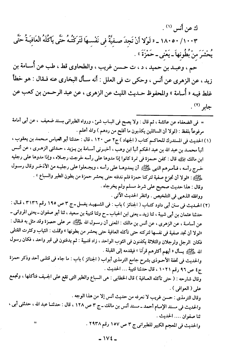1003/ 18050 - "لَوْلا أَنْ تَجِدَ صفِيَّةُ فِي نَفْسِهَا لَتَرَكتُهُ حَتَّى يَأكُلَهُ العَافِيَةُ حَتَّى يُحْشَرَ مِنْ بُطُونِها -يَعْنِي- حَمْزَةَ".