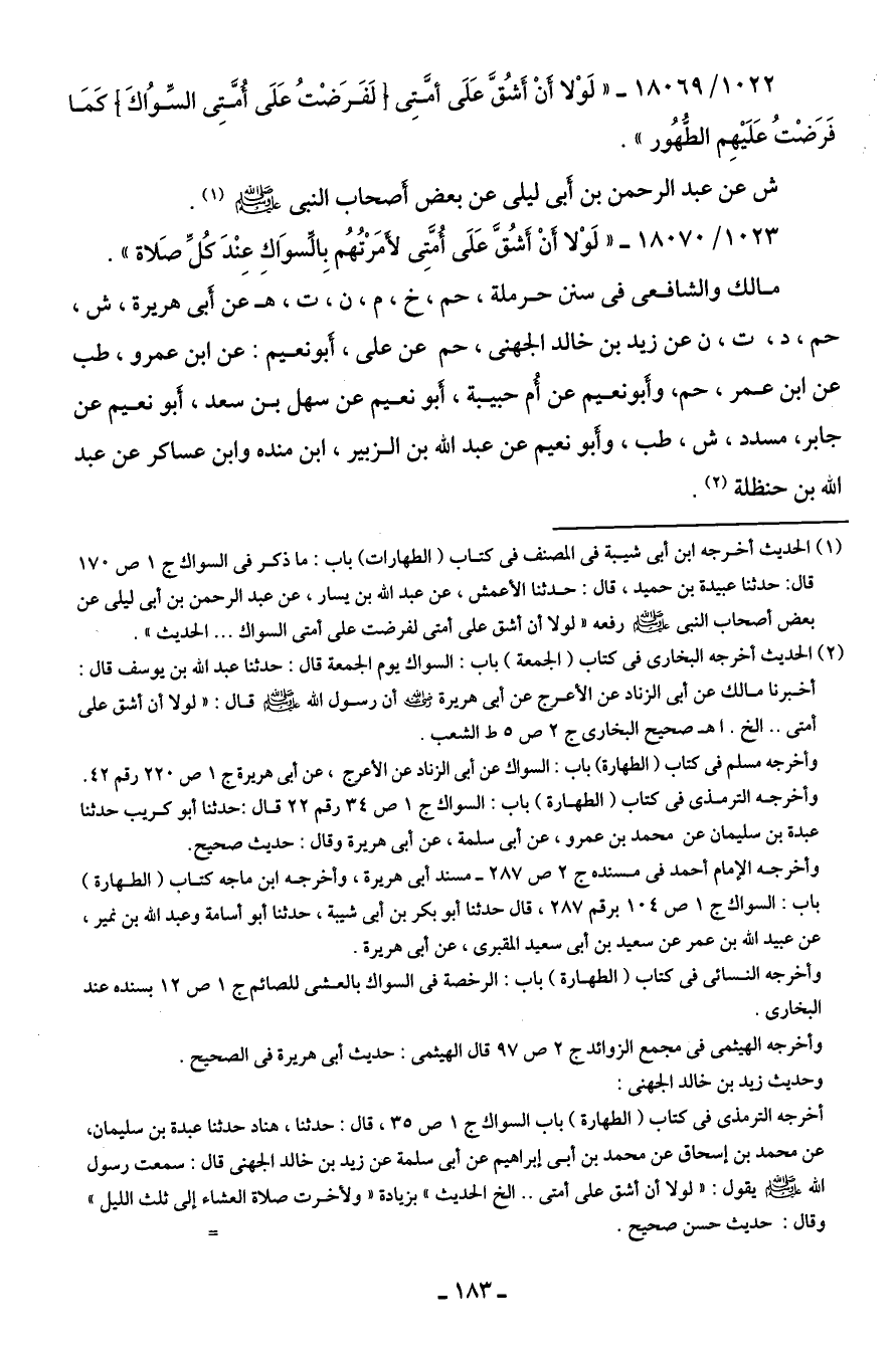 1022/ 18069 - "لَوْلا أَنْ أَشُقَّ عَلَى أمَّتِي [لَفَرَضْتُ عَلَى أُمَّتِي السِّوُاكَ] كَمَا فَرَضْتُ عَلَيهِم الطُّهُور".