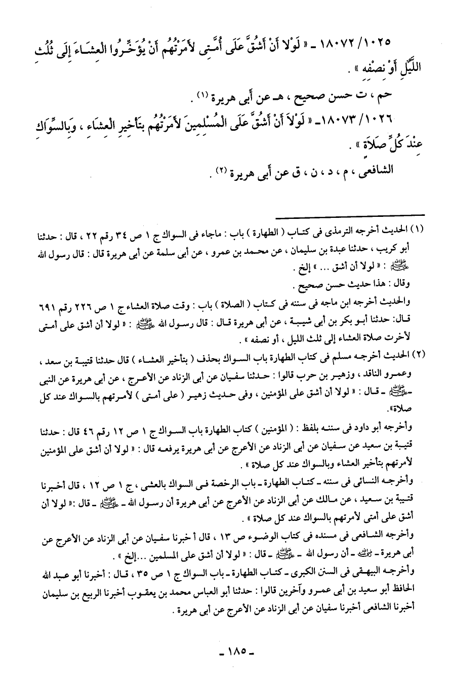 1026/ 18073 - "لَوْلَا أَنْ أَشُقَّ عَلَى الْمُسْلِمِينَ لأَمَرْتُهُم بتَأخِيرِ الْعِشَاءِ، وَبِالسِّوَاكِ عِنْدَ كُلِّ صَلاةٍ".