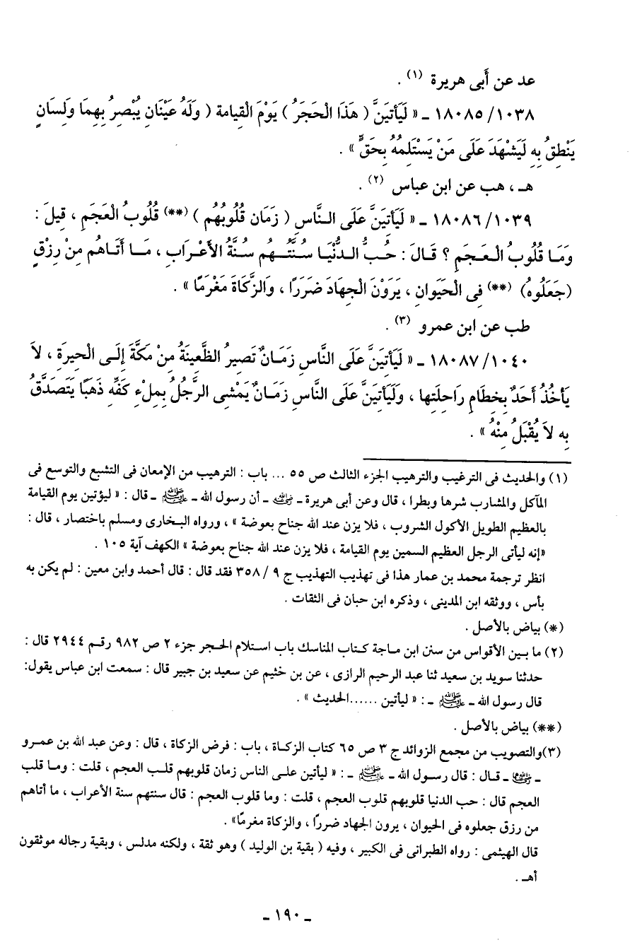 1038/ 18085 - "لَيَأتيَنَّ (هَذَا الْحَجَرُ) يَوْمَ الْقِيامة (وَلَهُ عَينَانِ يُبْصِرُ بِهِمَا وَلِسَانٍ يَنْطِقُ بِهِ لَيَشْهَدَ عَلَى مَنْ يَسْتَلِمُهُ بِحَقٍّ).
