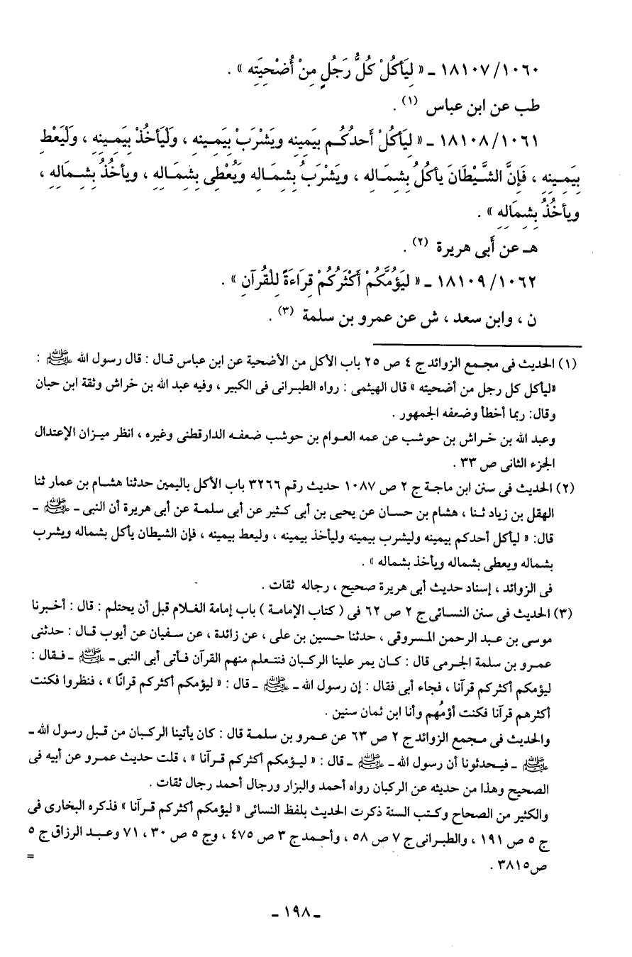 1061/ 18108 - "لِيَأكُلْ أَحدُكُم بيَمِينِه ويَشْرَبْ بِيَمِينهِ، وَلْيَأخُذْ بِيَمِينِهِ، وَلْيَعْطِ بِيَمِينِهِ، فَإِنَّ الشَّيطَانَ يأكُلُ بِشِمَالِه، ويَشْرَبُ بِشِمَالِه وَيُعْطِى بِشِمَالِهِ، ويأخُذُ بِشِمَالِهِ، ويأخُذُ بِشِمَالِهِ".