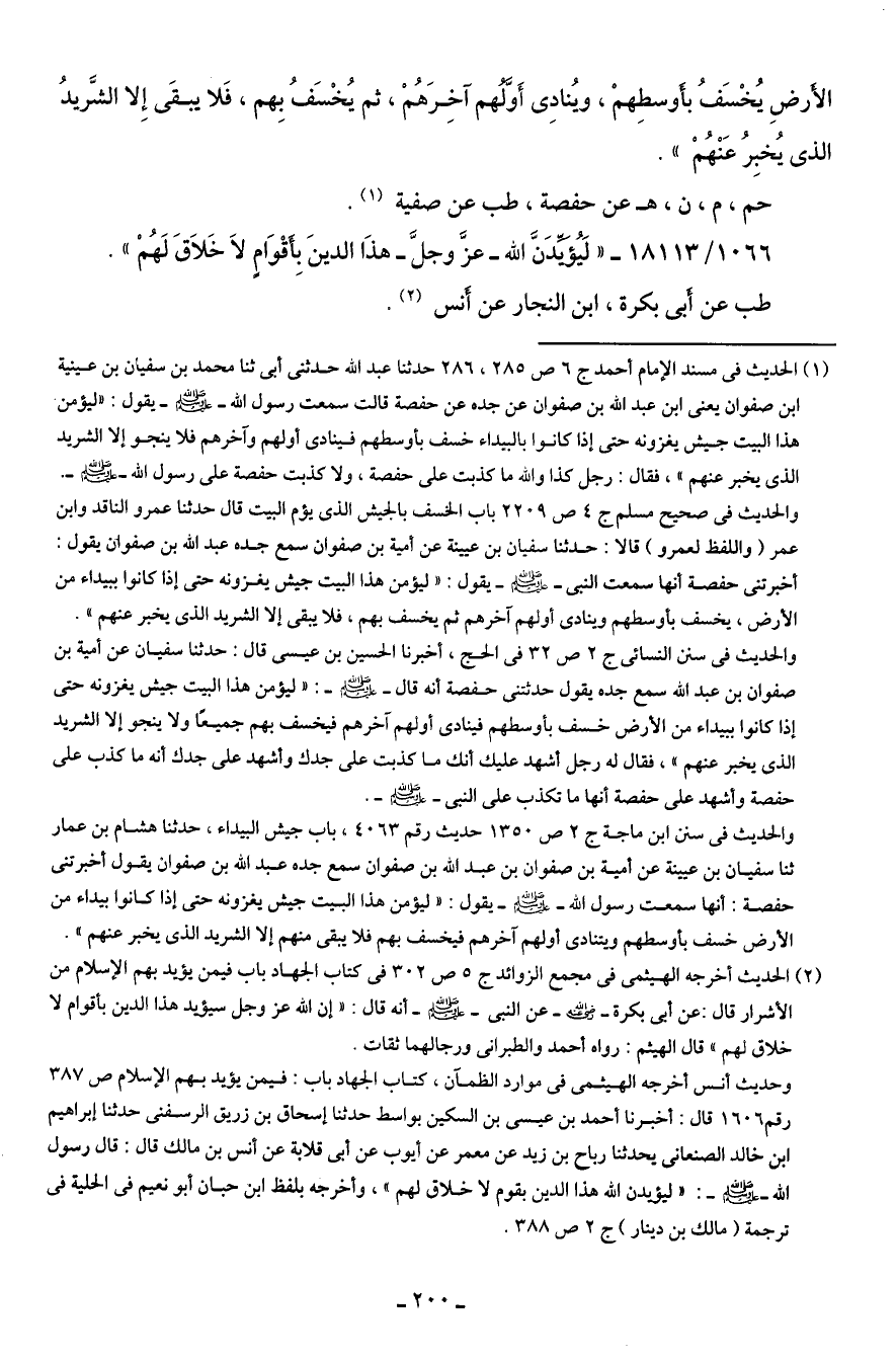 (¬1) الحديث في مسند الإمام أحمد ج 6 ص 285، 286 حدثنا عبد الله حدثني أبي ثنا محمَّد بن سفيان بن عينية ابن صفوان يعني ابن عبد الله بن صفوان عن جده عن حفصة قالت سمعت رسول الله - صلى الله عليه وسلم - يقول: "ليؤمن هذا البيت جيش يغزونه حتى إذا كانوا بالبيداء خسف بأوسطهم فينادى أولهم وآخرهم فلا ينجو إلا الشريد الذي يخبر عنهم"، فقال: رجل كذا والله ما كذبت على حفصة، ولا كذبت حفصة على رسول الله - صلى الله عليه وسلم -.