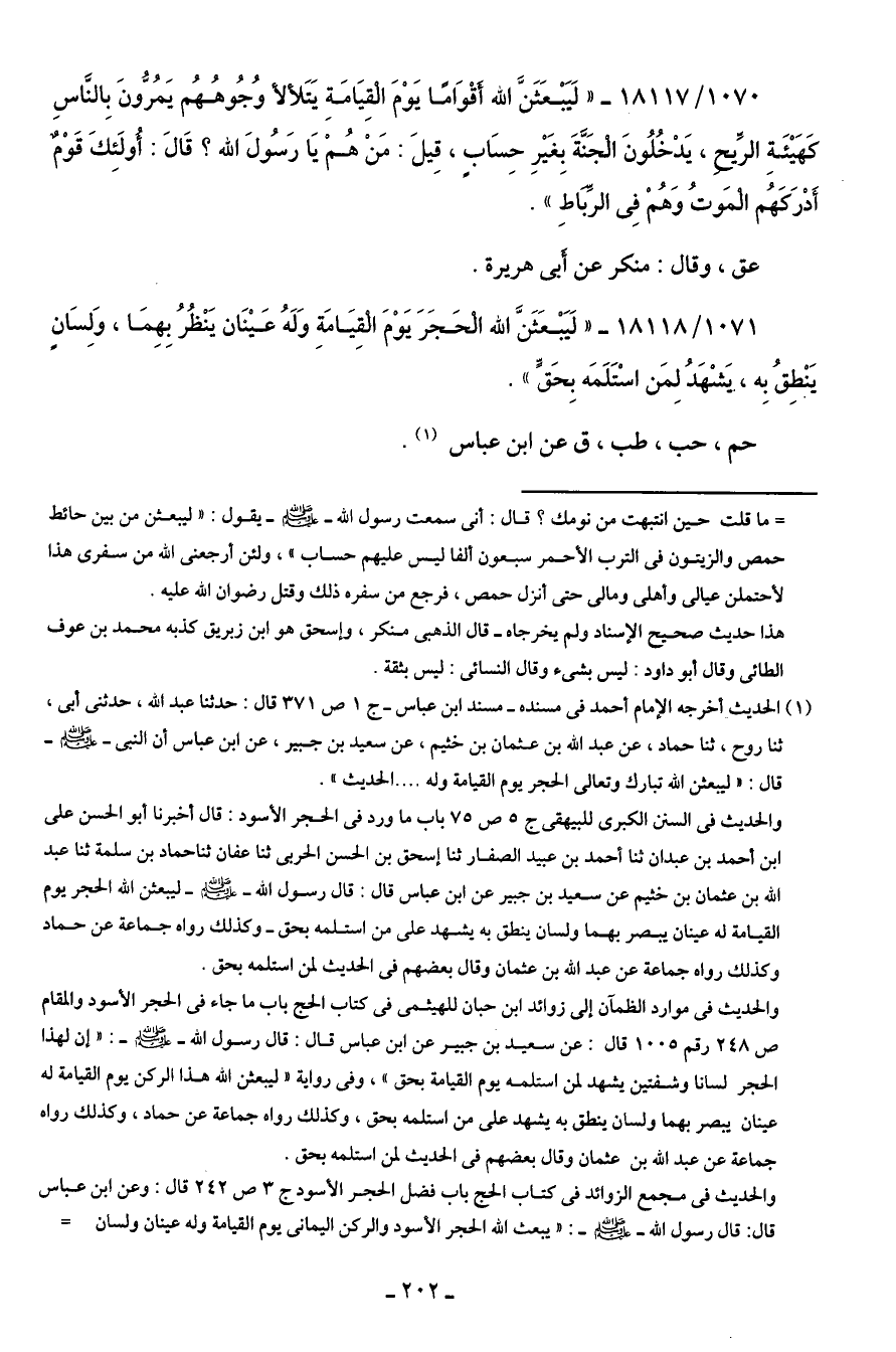1071/ 18118 - "لَيَبْعَثَنَّ الله الْحَجَرَ يَوْمَ الْقِيَامَةِ وَلَهُ عَينَان يَنْظُرُ بِهِمَا، وَلِسَانٍ يَنْطِقُ بِه، يَشْهَدُ لِمَن اسْتَلَمَه بِحَقٍّ".