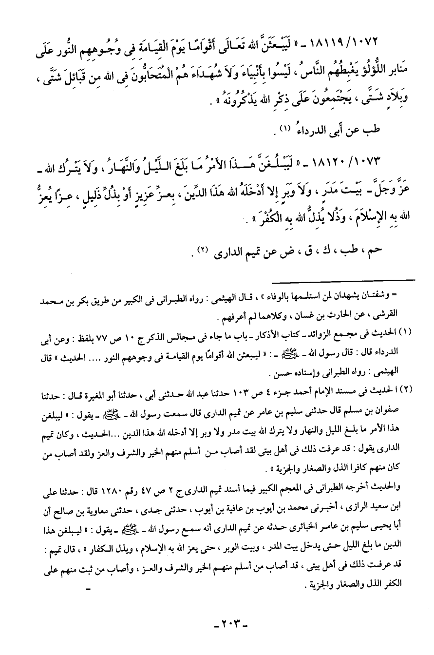 (¬2) الحديث في مسند الإمام أحمد جزء 4 ص 103 حدثنا عبد الله حدثني أبي، حدثنا أبو المغيرة قال: حدثنا صفوان بن مسلم قال حدثني سليم بن عامر عن تميم الدارى قال سمعت رسول الله - صلى الله عليه وسلم - يقول: "ليبلغن هذا الأمر ما بلغ الليل والنهار ولا يترك الله بيت مدر ولا وبر إلا أدخله الله هذا الدين. . . الحديث، وكان تميم الدارى يقول: قد عرفت ذلك في أهل بيتى لقد أصاب من أسلم منهم الخير والشرف والعز ولقد أصاب من كان منهم كافرا الذل والصغار والجزية".
