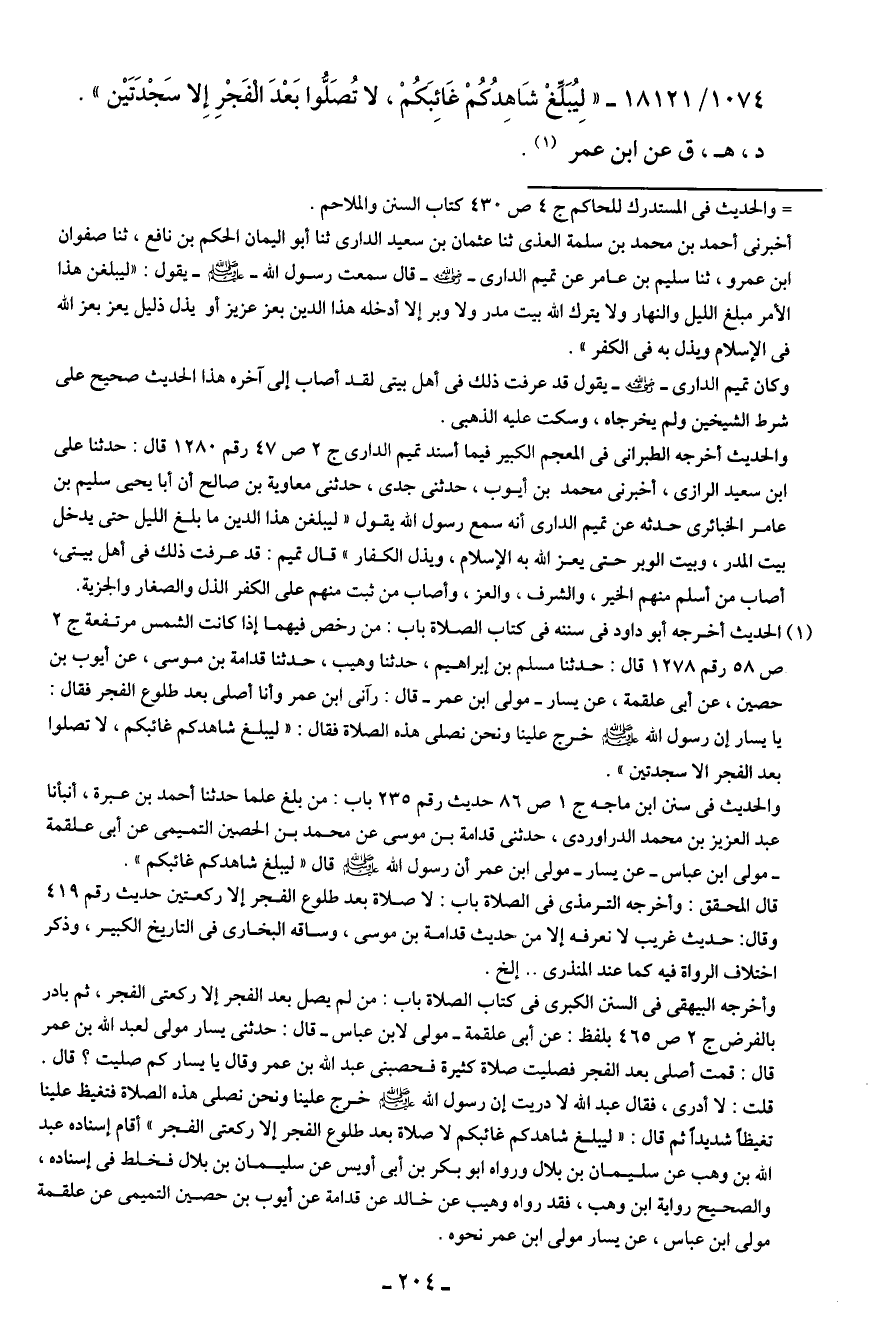 1074/ 18121 - "لِيُبَلِّغْ شَاهِدُكُمْ غَائِبَكُمْ، لا تُصَلُّوا بَعْدَ الْفَجْرِ إِلا سَجْدَتَين".