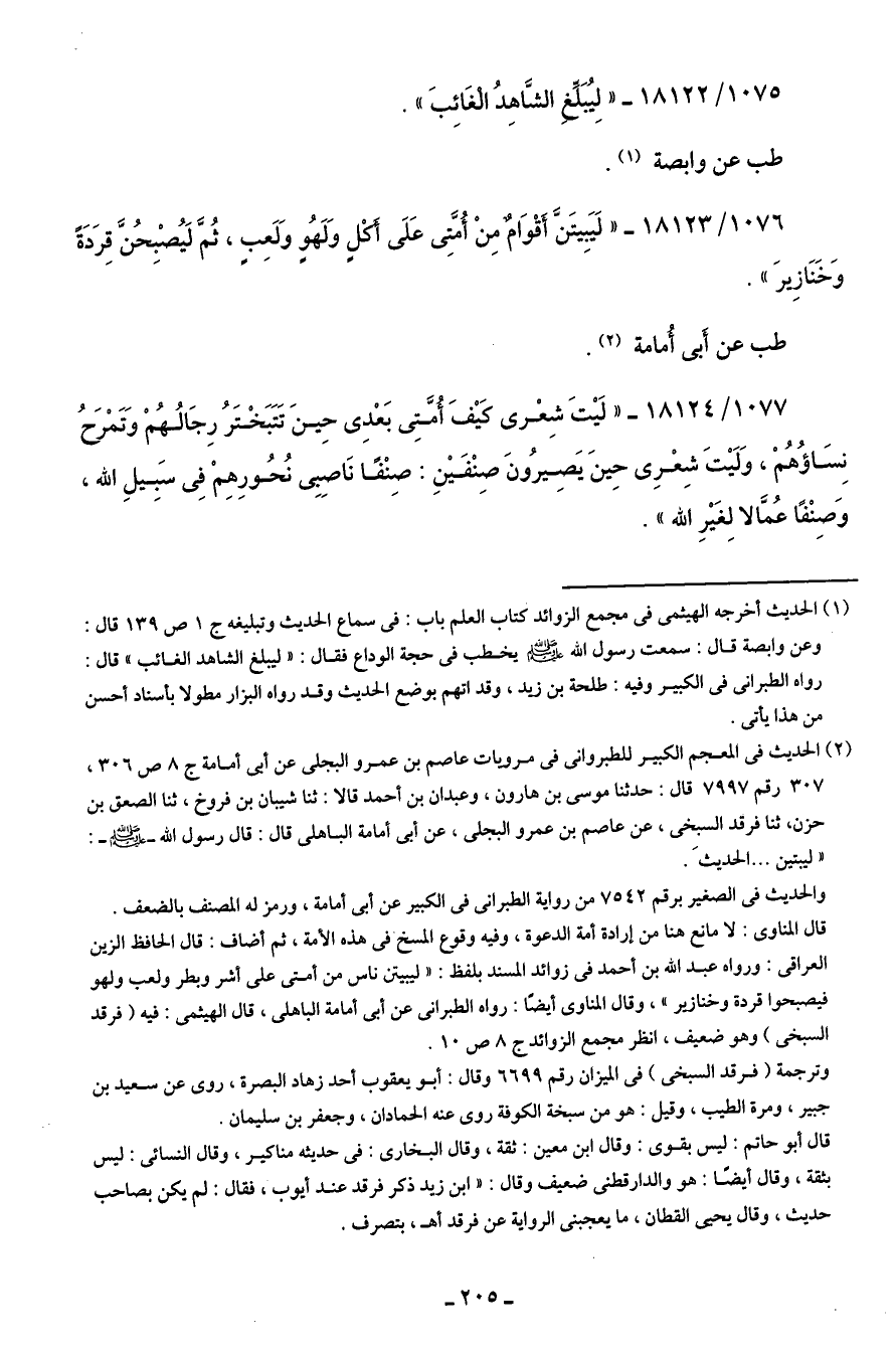 1077/ 18124 - "لَيتَ شِعْرى كَيفَ أُمَّتِي بَعْدِى حِينَ تَتَبَخْتَرُ رِجَالُهُمْ وَتَمْرَحُ نِسَاؤُهُمْ، وَلَيتَ شِعْرِى حِينَ يَصِيرُونَ صِنْفَينِ: صِنْفًا نَاصِبِى نُحُورِهِمْ فِي سَبِيلِ الله، وَصِنْفًا عُمَّالا لِغَيرِ الله".