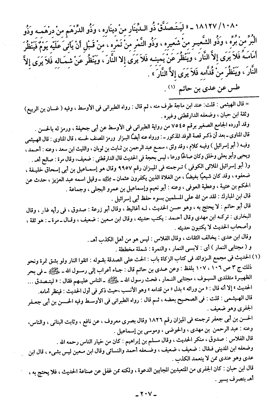 1080/ 18127 - "لِيَتَصَدَّقْ ذُو الدِّينَارِ مِنْ دِينَارِهِ، وَذُو الدِّرْهَمِ مِنْ دِرْهَمِهِ وَذُو الْبُرِّ مِنْ بُرِّهِ، وَذُو الشَّعِيرِ مِنْ شَعِيرِهِ، وَذُو التَّمْرِ مِنْ تَمْرِهِ، مِنْ قَبْلِ أَنْ يَأتِيَ عَلَيهِ يَوْمٌ فَيَنْظُرَ أَمَامَهُ فَلَا يَرَى إلا النَّارَ، وَيَنْظُرَ عَنْ يَمِينِهِ فَلَا يَرَى إِلا النَّارَ، وَيَنْظُر عَنْ شِمَالِهِ فَلَا يَرَى إلا النَّارَ، وَيَنْظُرَ مِنْ قُدَّامِهِ فَلَا يَرَى إِلَّا النَّارَ".