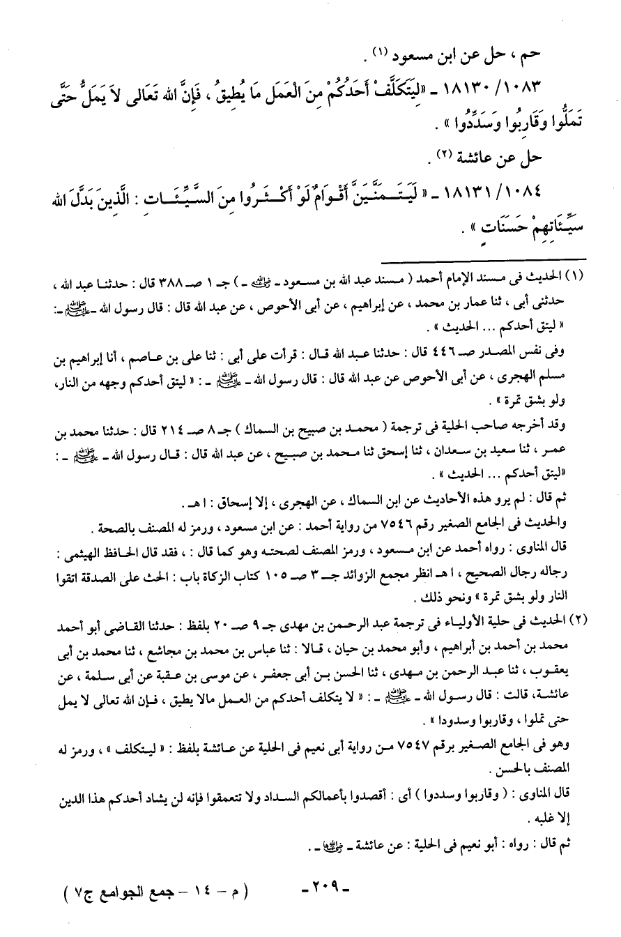 1083/ 18130 - "لِيَتَكَلَّفْ أَحَدُكُمْ مِنَ الْعَمَل مَا يُطيِقُ، فَإِنَّ الله تَعَالى لَا يَمَلُّ حَتَّى تَمَلُّوا وَقَارِبُوا وَسَدِّدُوا".