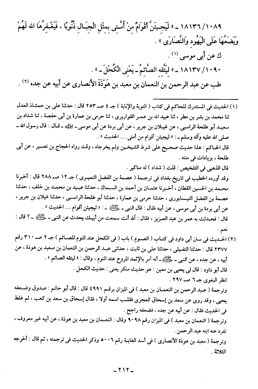 (¬1) الحديث في المستدرك للحاكم في كتاب (النوبة والإنابة) جـ 4 صـ 253 قال: حدثنا علي بن حمشاذ العدل ثنا محمد بن بشر بن مطر، ثنا عبيد الله بن عمر القواريرى، ثنا حرمى بن عمارة بن أَبي حفصة، ثنا شداد بن سعيد أبو طلحة الراسبى، عن غيلان بن جرير، عن أَبي بردة عن أَبي موسى - رضي الله عنه - قال: قال رسول الله- صلى الله عليه وآله وسلم -: "ليجيئن أقوام من أمتى ... الحديث".
