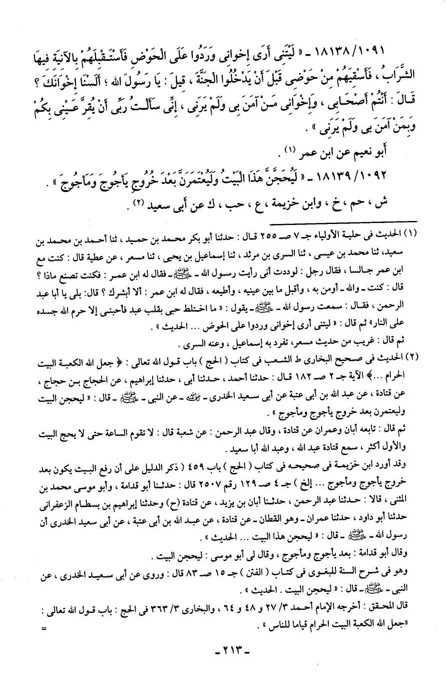 1092/ 18139 - "لَيُحَجَّنَّ هَذَا الْبَيتُ وَلَيُعْتَمَرَنَّ بَعْدَ خُرُوجِ يَأجُوجَ وَمَأجُوجَ".