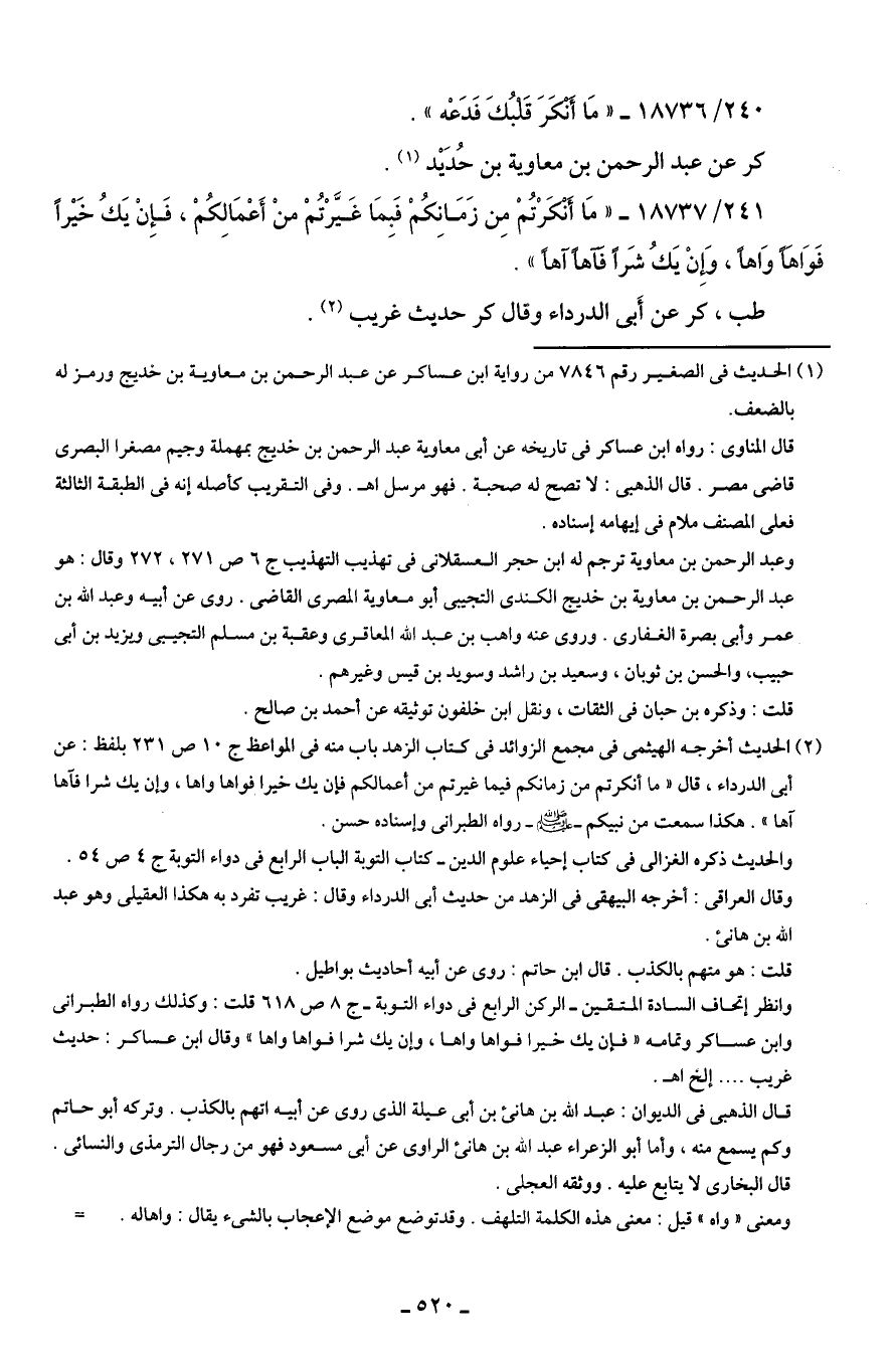 (¬2) الحديث أخرجه الهيثمي في مجمع الزوائد في كتاب الزهد باب منه في المواعظ ج 10 ص 231 بلفظ: عن أبي الدرداء، قال "ما أنكرتم من زمانكم فيما غيرتم من أعمالكم فإن يك خيرا فواها واها، وإن يك شرا فآها آها". هكذا سمعت من نبيكم - صلى الله عليه وسلم - رواه الطبراني وإسناده حسن.