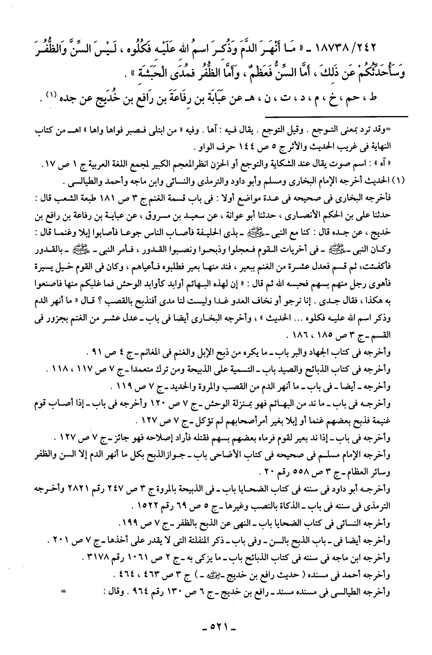 242/ 18738 - "مَا أَنْهَرَ الدَّمَ وَذُكِرَ اسمُ اللهِ عَلَيه فَكُلُوه، لَيسَ السِّنَّ وَالظُّفُرَ وَسَأُحَدِّثُكُمْ عَن ذَلِكَ، أمَّا السِّنُّ فَعَظْمٌ، وَأَمَّا الظُّفُر فمُدَى الْحَبَشَةِ".