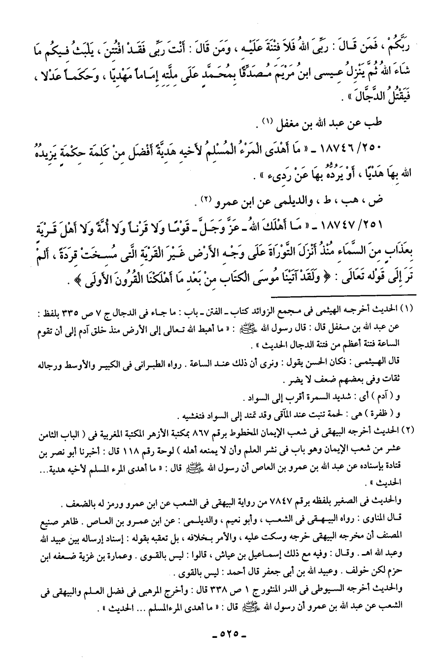 (¬2) الحديث أخرجه البيهقي في شعب الإيمان المخطوط برقم 867 بمكتبة الأزهر المكتبة المغربية في (الباب الثامن عشر من شعب الإيمان وهو باب في نشر العلم وأن لا يمنعه أهله) لوحة رقم 118 قال: أخبرنا أبو نصر بن قتادة بإسناده عن عبد الله بن عمرو بن العاص أن رسول الله - صلى الله عليه وسلم - قال: "ما أهدى المرء المسلم لأخيه هدية ... الحديث".