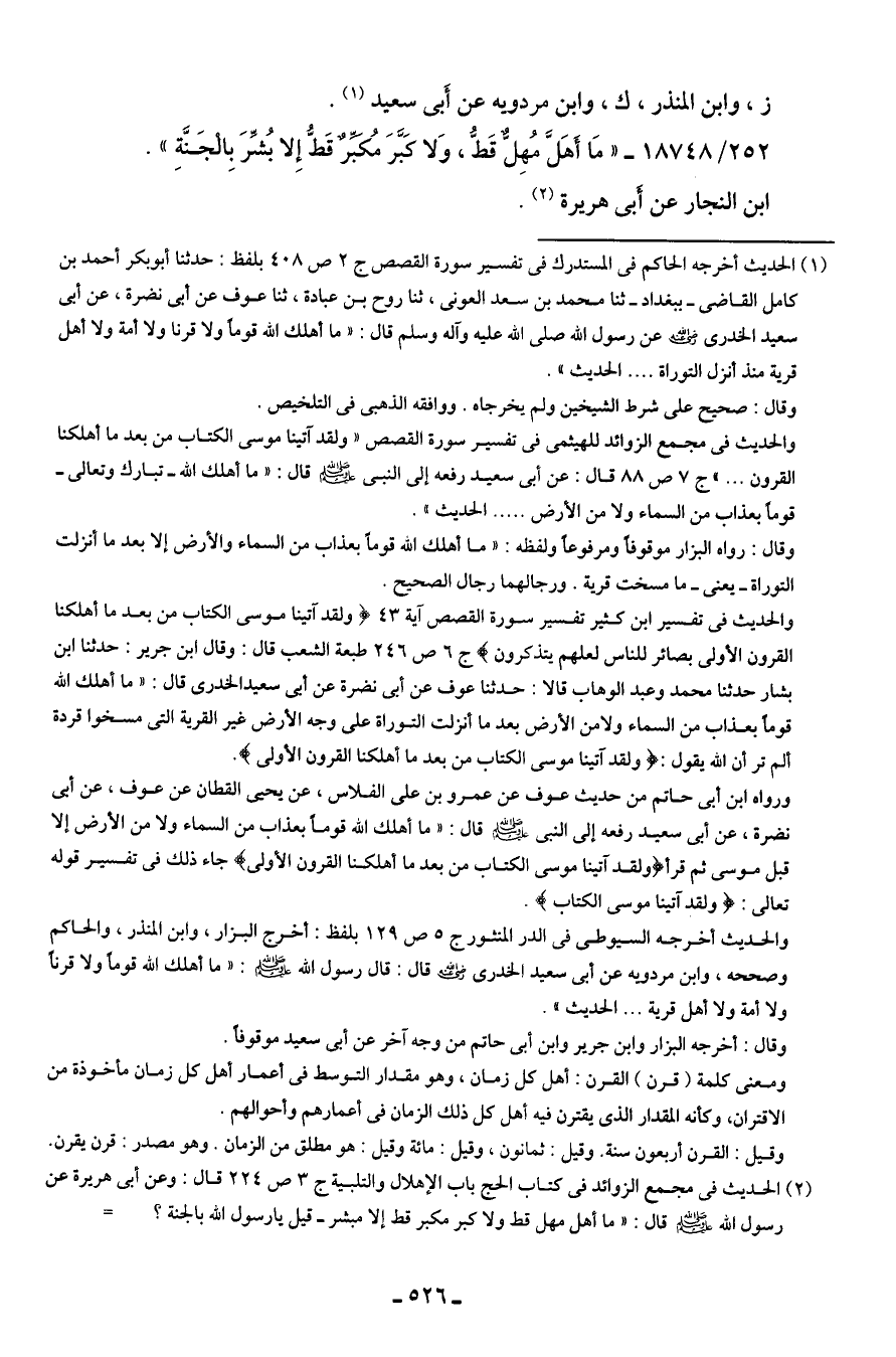 (¬1) الحديث أخرجه الحاكم في المستدرك في تفسير سورة القصص ج 2 ص 408 بلفظ: حدثنا أبو بكر أحمد بن كامل القاضي -ببغداد- ثنا محمد بن سعد العونى، ثنا روح بن عبادة، ثنا عوف عن أبي نضرة، عن أبي سعيد الخدري - رضي الله عنه - عن رسول الله صلى الله عليه وآله وسلم قال: "ما أهلك الله قومًا ولا قرنا ولا أمة ولا أهل قرية منذ أنزل التوراة. الحديث".