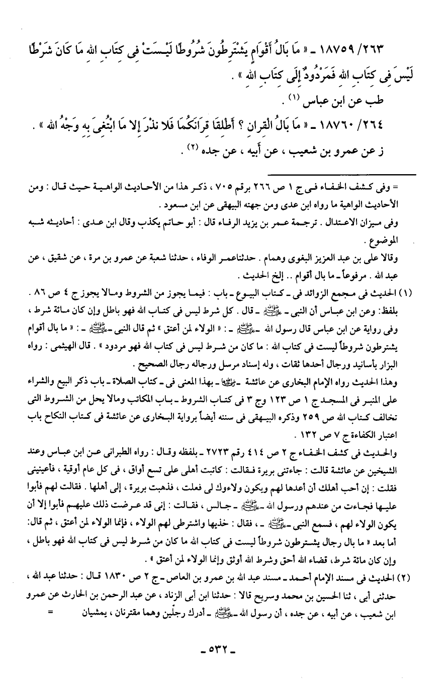263/ 18759 - "مَا بَالُ أَقْوَامٍ يَشْتَرِطُونَ شُرُوطًا لَيسَتْ فِي كتَابِ اللهِ مَا كَانَ شَرْطًا لَيسَ فِي كتَابِ اللهِ فَمَرْدُودٌ إِلَى كتَابِ اللهِ".