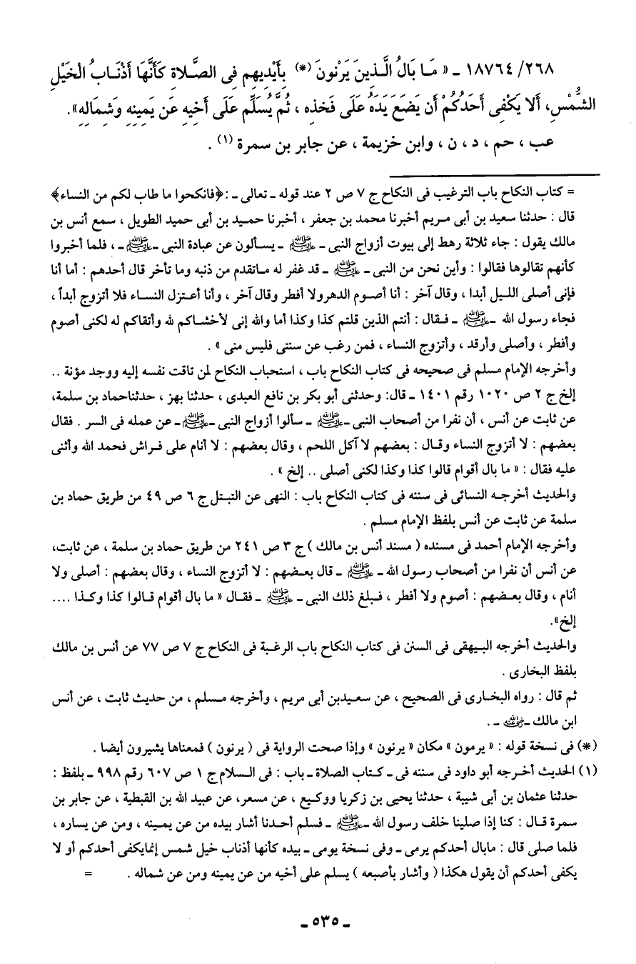 = كتاب النكاح باب الترغيب في النكاح ج 7 ص 2 عند قوله -تعالى-: {فَانْكِحُوا مَا طَابَ لَكُمْ مِنَ النِّسَاءِ} قال: حدثنا سعيد بن أبي مريم أخبرنا محمد بن جعفر، أخبرنا حميد بن أبي حميد الطويل، سمع أنس بن مالك يقول: جاء ثلاثة رهط إلى بيوت أزواج النبي - صلى الله عليه وسلم - يسألون عن عبادة النبي - صلى الله عليه وسلم -، فلما أخبروا كأنهم تقالوها فقالوا: وأين نحن من النبي - صلى الله عليه وسلم - قد غفر له ما تقدم من ذنبه وما تأخر قال أحدهم: أما أنا فإني أصلى الليل أبدا، وقال آخر: أنا أصوم الدهر ولا أفطر وقال آخر، وأنا أعتزل النساء فلا أتزوج أبدًا، فجاء رسول الله - صلى الله عليه وسلم - فقال: أنتم الذين قلتم كذا وكذا أما والله إني لأخشاكم لله وأتقاكم له لكنى أصوم وأفطر، وأصلى وأرقد، وأتزوج النساء، فمن رغب عن سنتى فليس منى".