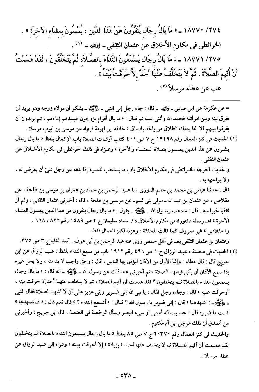 (¬1) الحديث في كنز العمال رقم 19498 ج 7 ص 401 كتاب أوقات الصلاة باب الإكمال بلفظ "ما بال رجال ينفرون عن هذا الدين يمسون بصلاة العشاء والآخرة" وعزاه في ذلك الخرائطى في مكارم الأخلاق عن عثمان الثقفى.
