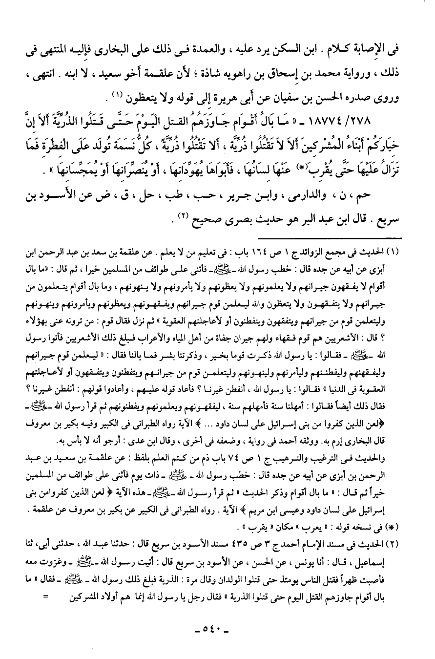 278/ 18774 - "مَا بَالُ أَقْوَام جَاوزَهُمُ القتل الْيَوْمَ حَتَّى قَتَلُوا الذُّرِّيَّةَ أَلا إِنَّ خِيَارَكُمْ أَبْنَاءُ الْمُشْركِينَ أَلا لَا تَقْتُلُوا ذُرِّيَّة، أَلا تَقْتُلُوا ذُرِّيَّةً، كُلُّ نَسَمَة تولَد عَلَى الْفِطرَةِ فَمَا تَزَالُ عَلَيهَا حَتَّى يُقْرِبَ (*) عَنْهَا لِسَانُهَا، فَأَبَوَاهَا يُهَوِّدَانِهَا، أوْ يُنَصِّرَانِهَا أَوْ يُمَجِّسَانهَا".