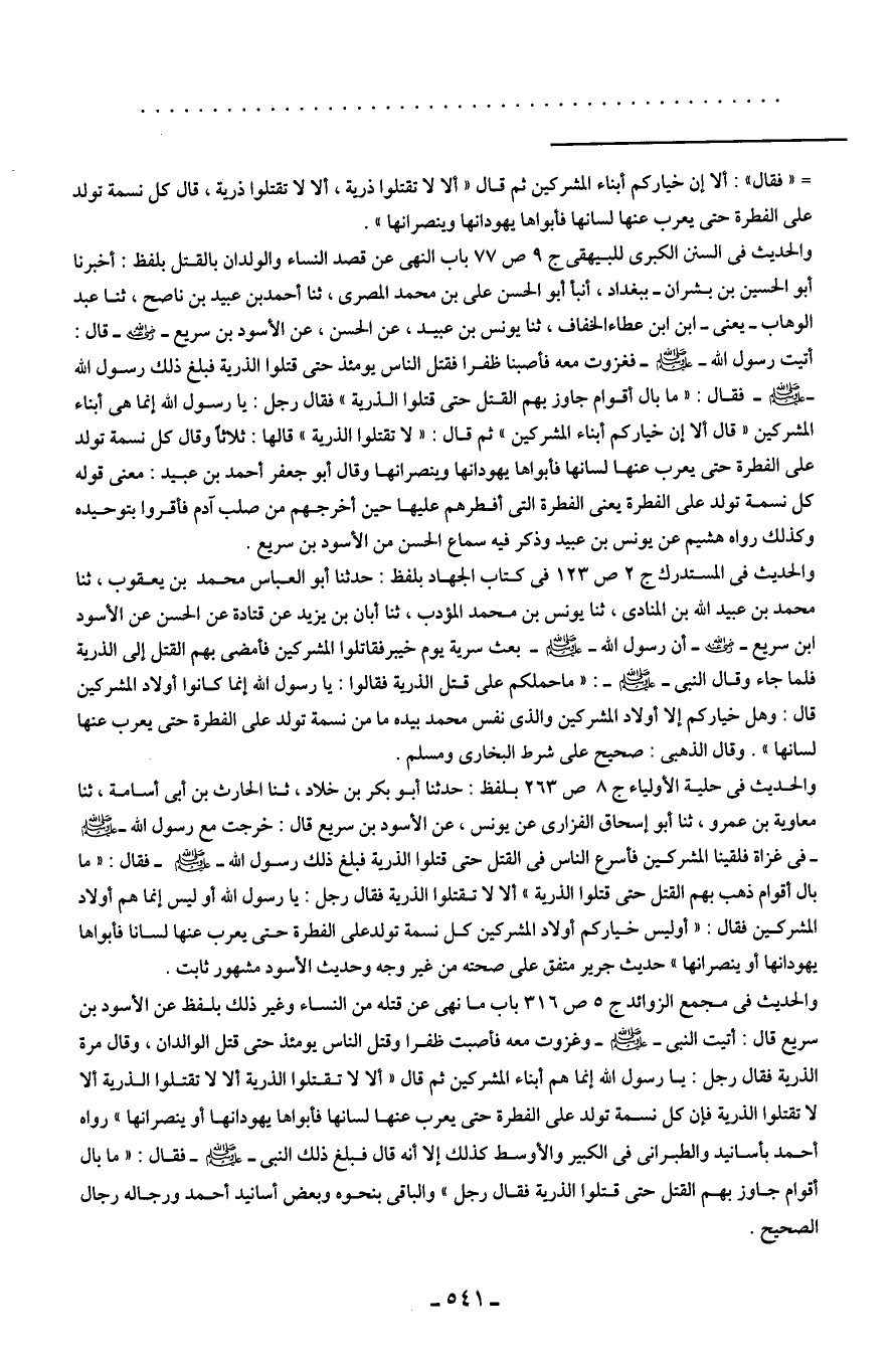 = "فقال": ألا إن خياركم أبناء المشركين ثم قال "ألا لا تقتلوا ذرية، ألا لا تقتلوا ذرية، قال كل نسمة تولد على الفطرة حتى يعرب عنها لسانها فأبواها يهودانها وينصرانها".