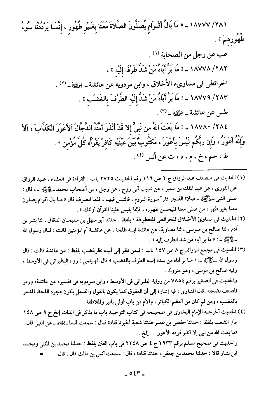 284/ 18780 - "مَا بَعَثَ اللهُ مِنْ نَبِيٍّ إلا قَدْ أَنْذَرَ أُمَّتَهُ الدَّجَّال الأَعْوَرَ الْكَذَّابِ، أَلَا وَإِنَّه أَعْوَرُ، وَإِنَّ رَبَّكُمْ لَيسَ بِأَعْوَرَ، مَكْتُوبٌ بَينَ عَينَيهِ كَافِرٌ يقرَأُه كُلُّ مُؤْمِنٌ".