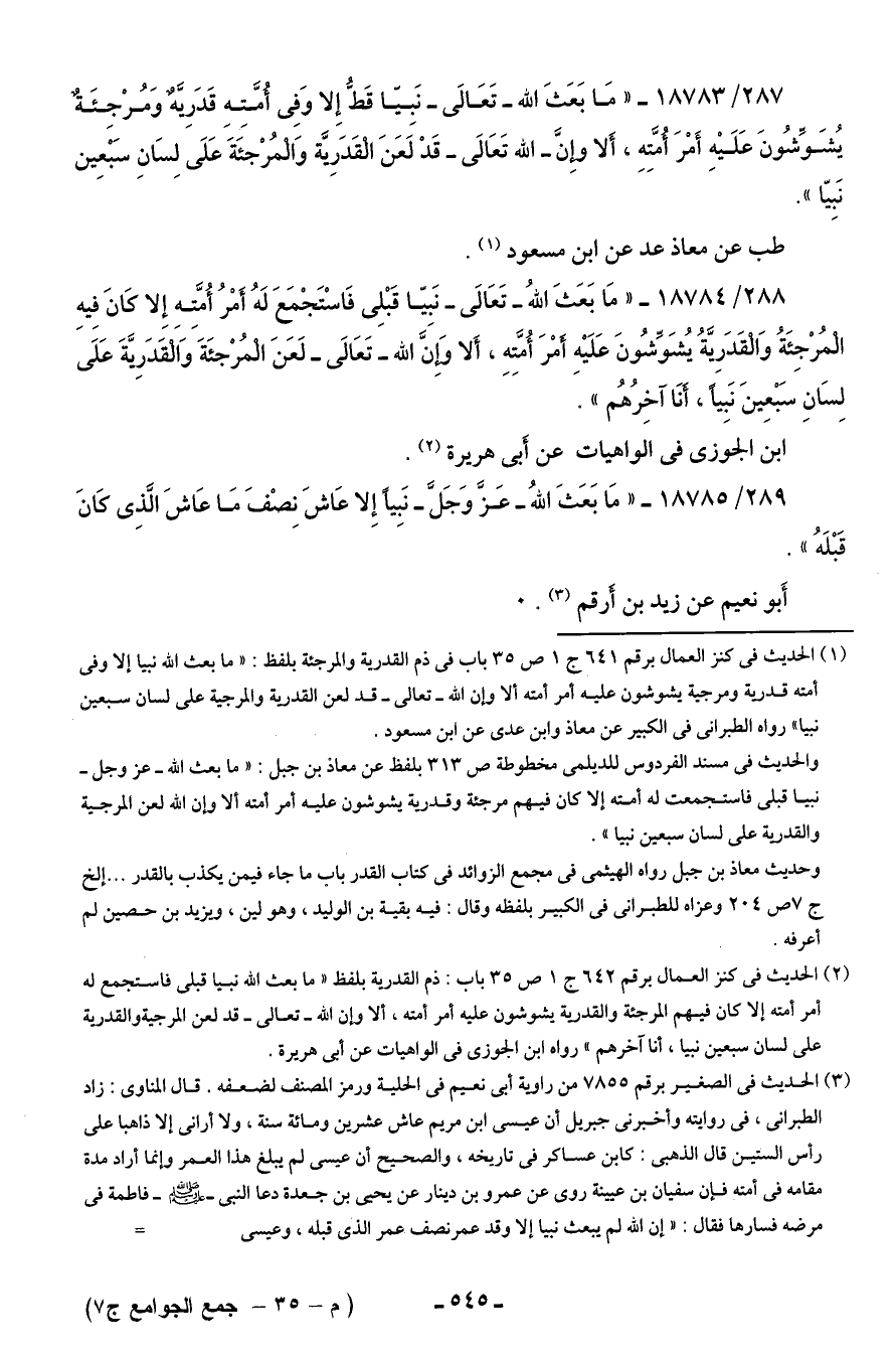 (¬2) الحديث في كنز العمال برقم 642 ج 1 ص 35 باب: ذم القدرية بلفظ "ما بعث الله نبيا قبلي فاستجمع له أمر أمته إلا كان فيهم المرجئة والقدرية يشوشون عليه أمر أمته، ألا وإن الله - تعالى - قد لعن المرجية والقدرية على لسان سبعين نبيا، آنا آخرهم" رواه ابن الجوزي في الوهيات عن أبي هريرة.