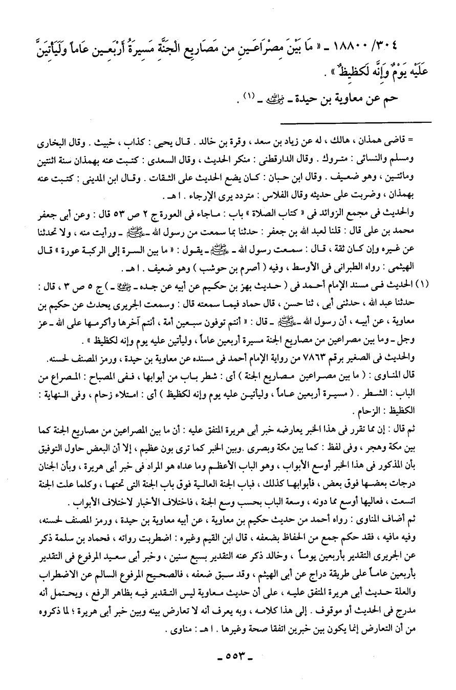 304/ 18800 - "مَا بَينَ مِصْرَاعَينِ من مَصَاريِع الْجَنَّةِ مَسِيرَةُ أَرْبَعِينَ عَامًا وَلَيَأْتِيَنَّ عَلَيه يَوْمٌ وإنَّه لَكَظيِظٌ".