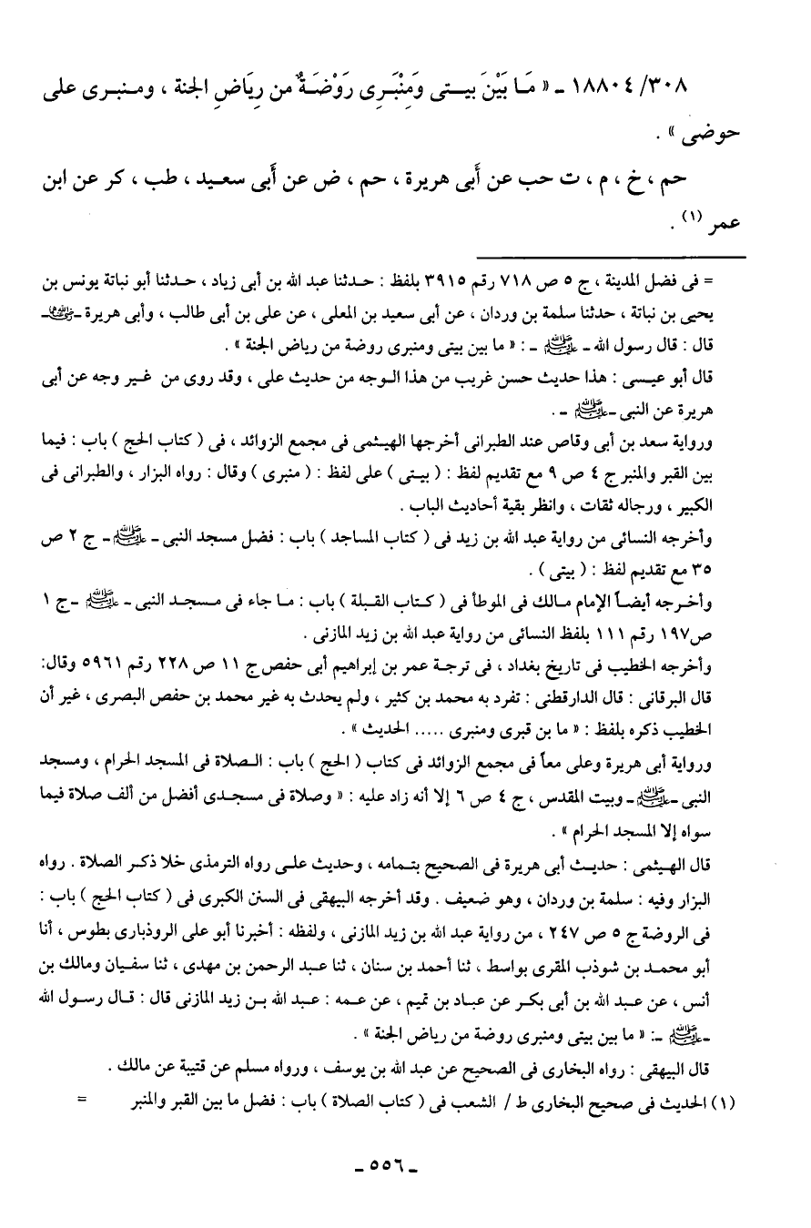 308/ 18804 - "مَا بَينَ بيتى وَمِنْبَرِى رَوْضَةٌ من رِيَاضِ الجنة، ومنبرى على حوضى".