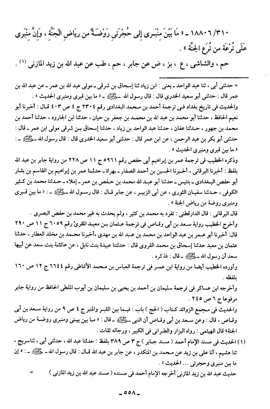 310/ 18806 - "مَا بَينَ مِنْبَرى إِلى حُجْرَتي رَوْضَةٌ من ريَاضِ الْجَنَّةِ، وَإنَّ مِنْبَرى عَلَى تُرْعَة من تُرعَ الجنَّة".