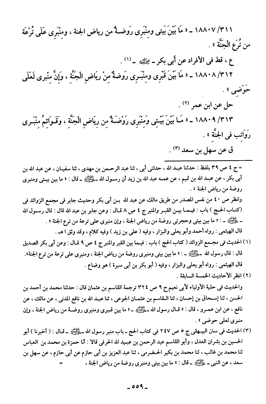 313/ 18809 - "مَا بَينَ بَيتِى وَمنْبَرِى رَوْضَة مِن رِيَاضِ الْجَنَّة، وَقَوَائِمُ منْبَرى رَوَاتِب في الجنَّةِ". ق عن سهل بن سعد (¬3).