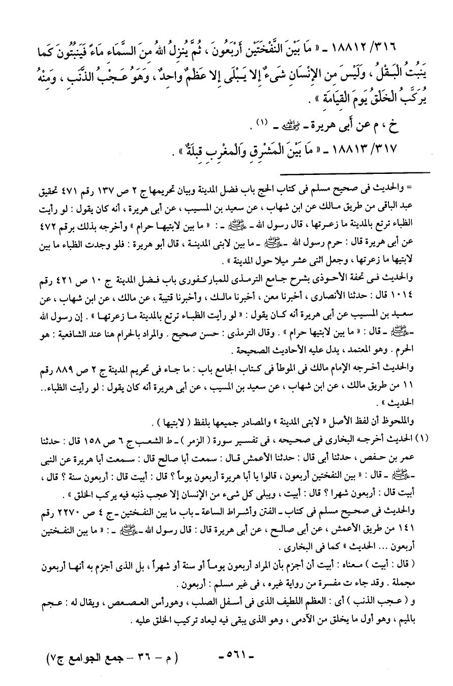 316/ 18812 - "مَا بَينَ النَّفْخَتَين أَرْبَعُونَ، ثُمَّ يُنزِلُ اللهُ مِنَ السَّمَاءِ مَاءً فَيَنبُتُونَ كَما يَنْبُتُ الْبَقْلُ، وَلَيسَ مِن الإِنْسَانِ شَيءٌ إِلا يَبْلَى إِلا عَظْمٌ واحِدٌ، وَهَوُ عَجْبُ الذَّنَبِ، وَمِنْهُ يُرَكَّبُ الْخَلْقُ يَومَ الْقِيَامَةِ".