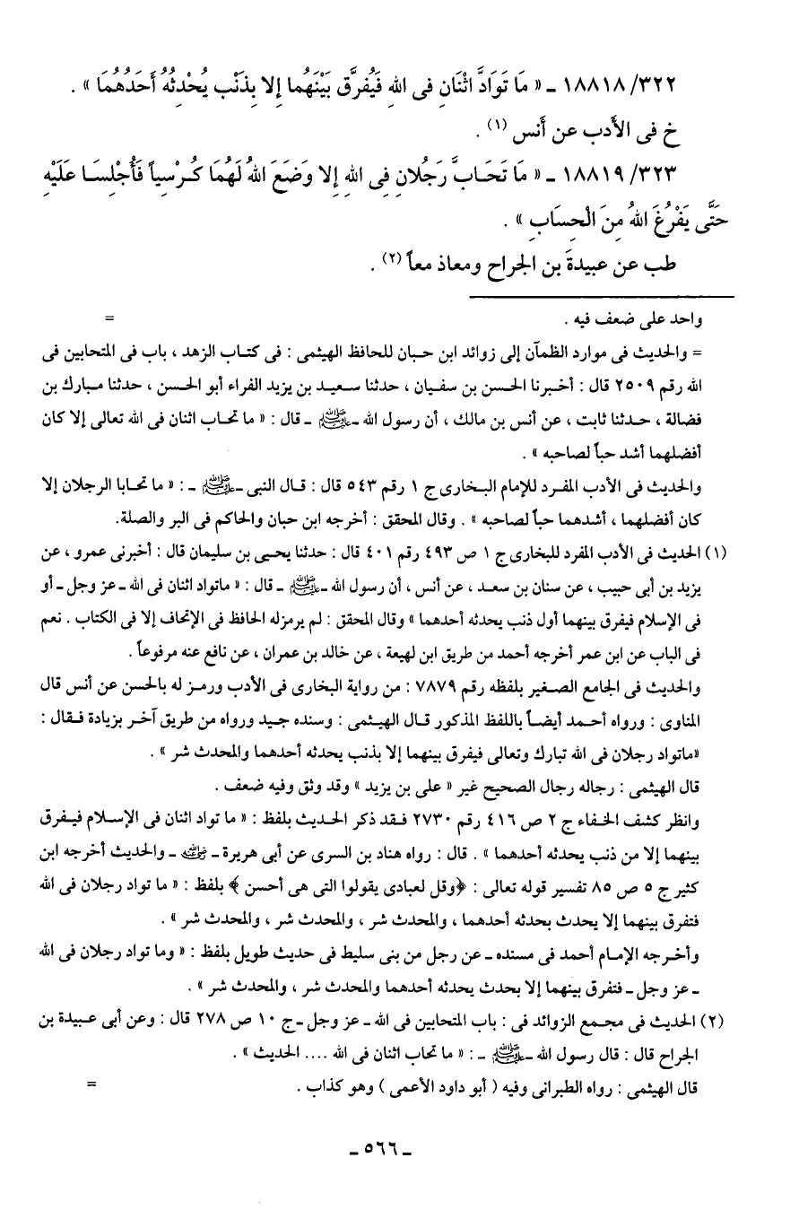 (¬2) الحديث في مجمع الزوائد في: باب المتحابين في الله - عزَّ وجلَّ - ج 10 ص 278 قال: وعن أبي عبيدة بن الجراح قال: قال رسول الله - صلى الله عليه وسلم -: "ما تحاب اثنان في الله. الحديث".