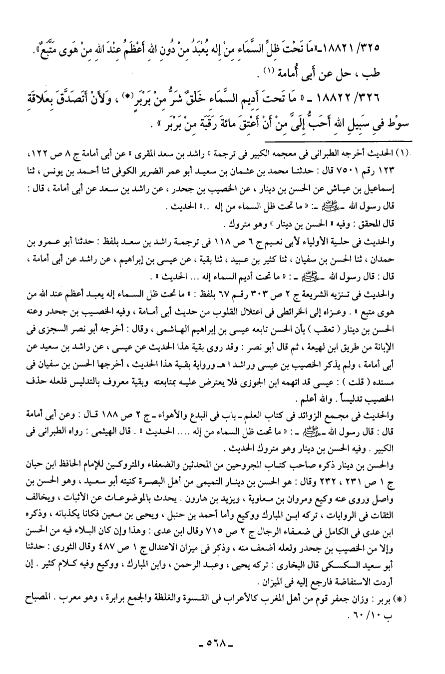 326/ 18822 - "مَا تَحتَ أَدِيم السَّمَاءٍ خَلْقٌ شَرُّ مِنْ بَرْبَرٍ (*)، وَلأَنْ أَتَصَدَّقَ بِعَلَاقَةِ سوْط في سَبِيلِ اللهِ أَحَبُّ إِلَيَّ مِنْ أَنْ أَعْتِقَ مائةَ رقَبَةٍ مِن بَرْبَر".