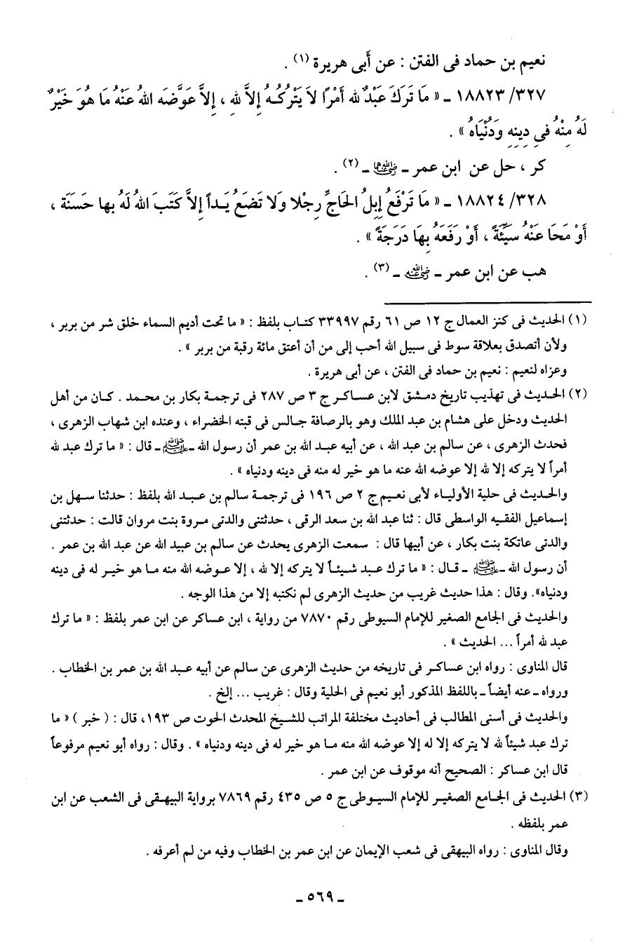 (¬2) الحديث في تهذيب تاريخ دمشق لابن عساكر ج 3 ص 287 في ترجمة بكار بن محمد. كان من أهل الحديث ودخل على هشام بن عبد الملك وهو بالرصافة جالس في قبته الخضراء، وعنده ابن شهاب الزهري، فحدث الزهري، عن سالم بن عبد الله، عن أبيه عبد الله بن عمر أن رسول الله - صلى الله عليه وسلم - قال: "ما ترك عبد لله أمرًا لا يتركه إلا لله إلا عوضه الله عنه ما هو خير له منه في دينه ودنياه".