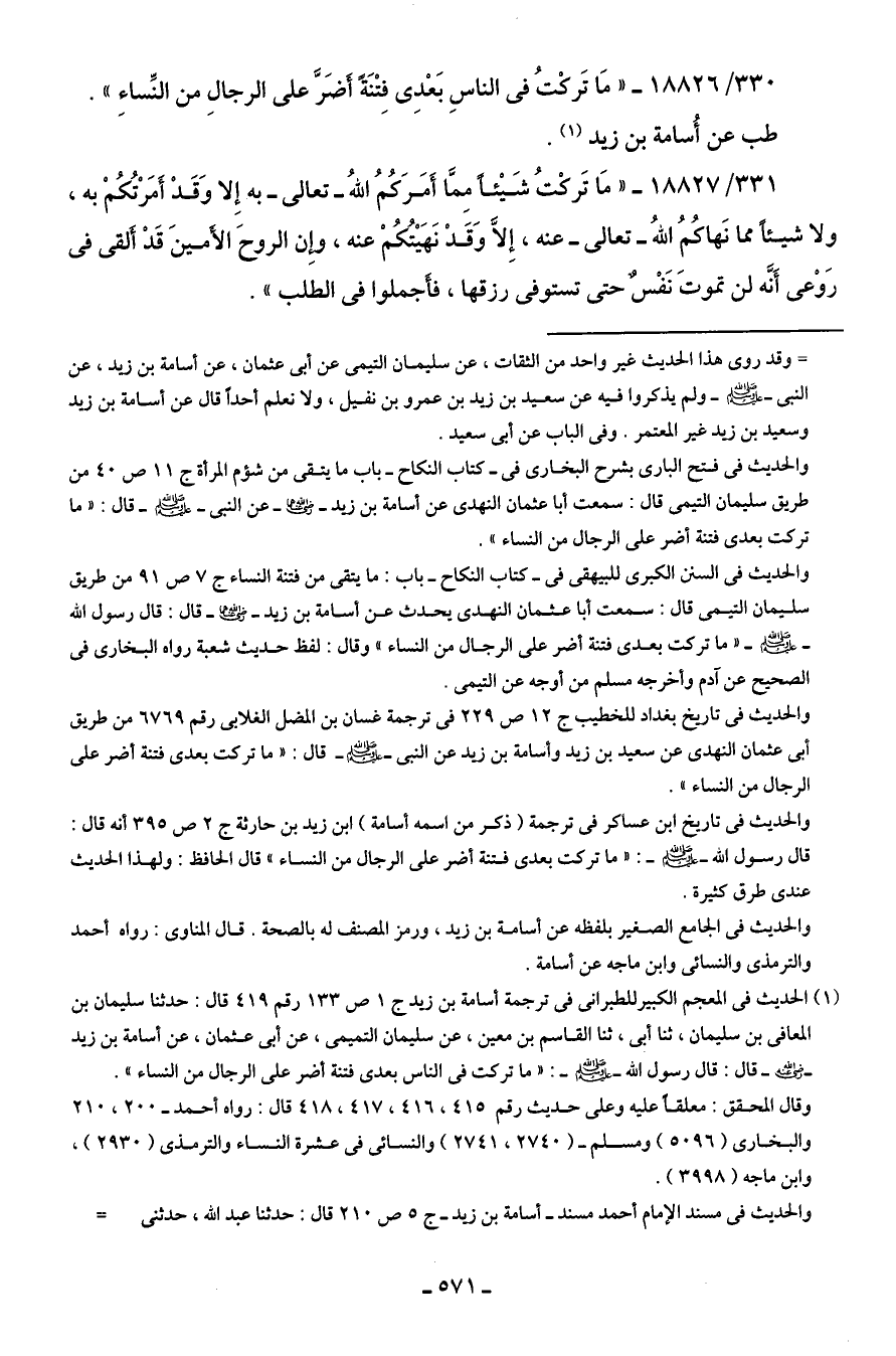 330/ 18826 - "مَا تَركْتُ في الناسِ بَعْدى فتْنَةً أضَرَّ على الرجال من النِّساء".