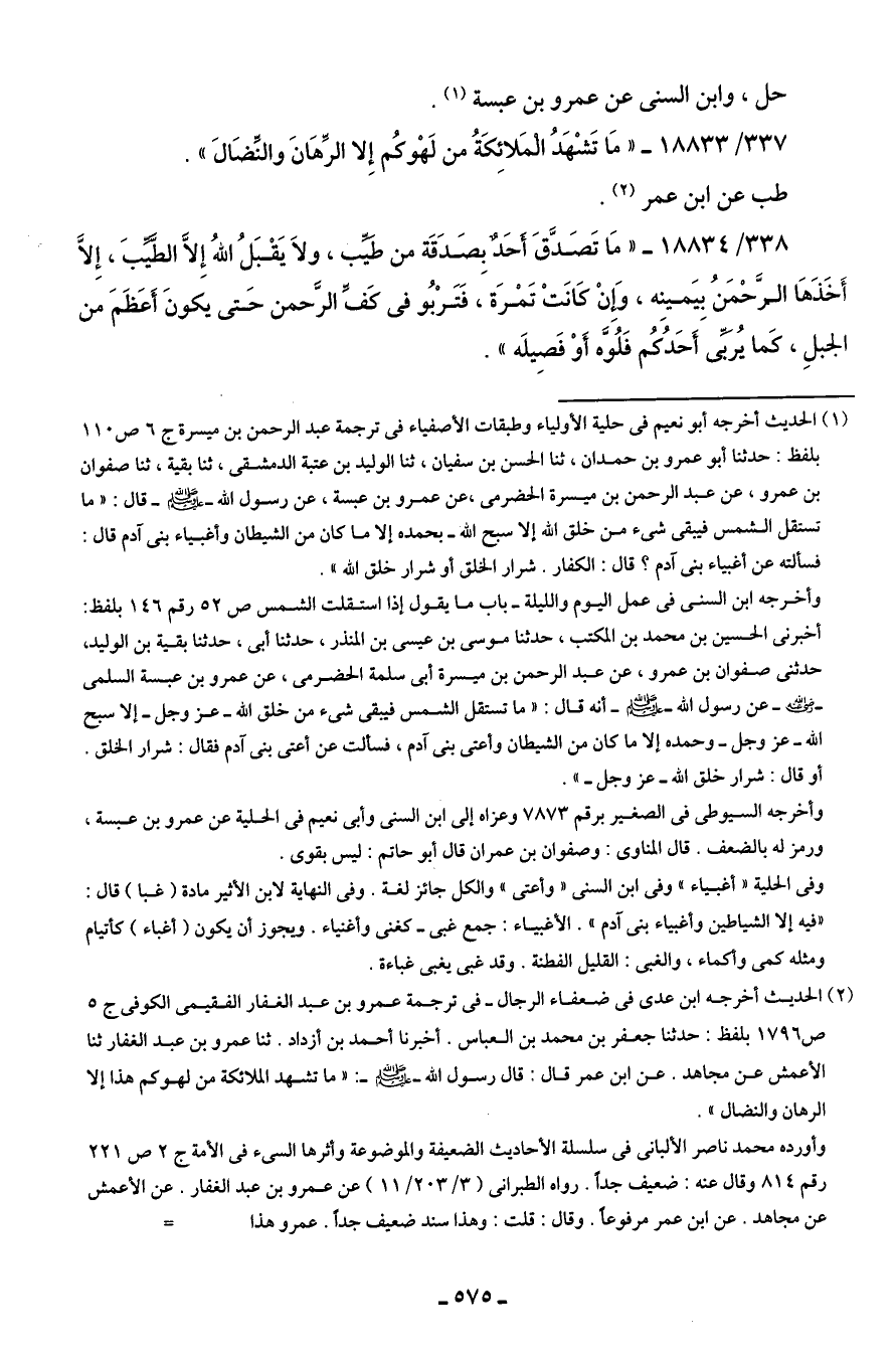 (¬1) الحديث أخرجه أبو نعيم في حلية الأولياء وطبقات الأصفياء في ترجمة عبد الرحمن بن ميسرة ج 6 ص 110 بلفظ: حدثنا أبو عمرو بن حمدان، ثنا الحسن بن سفيان، ثنا الوليد بن عتبة الدمشقي، ثنا بقية، ثنا صفوان بن عمرو، عن عبد الرحمن بن ميسرة الحضرمى، عن عمرو بن عبسة، عن رسول الله - صلى الله عليه وسلم - قال: "ما تستقل الشمس فيبقى شيء من خلق الله إلا سبح الله- بحمده إلا ما كان من الشيطان وأغبياء بنى آدم قال: فسألته عن أغبياء بنى آدم؟ قال: الكفار. شرار الخلق أو شرار خلق الله".