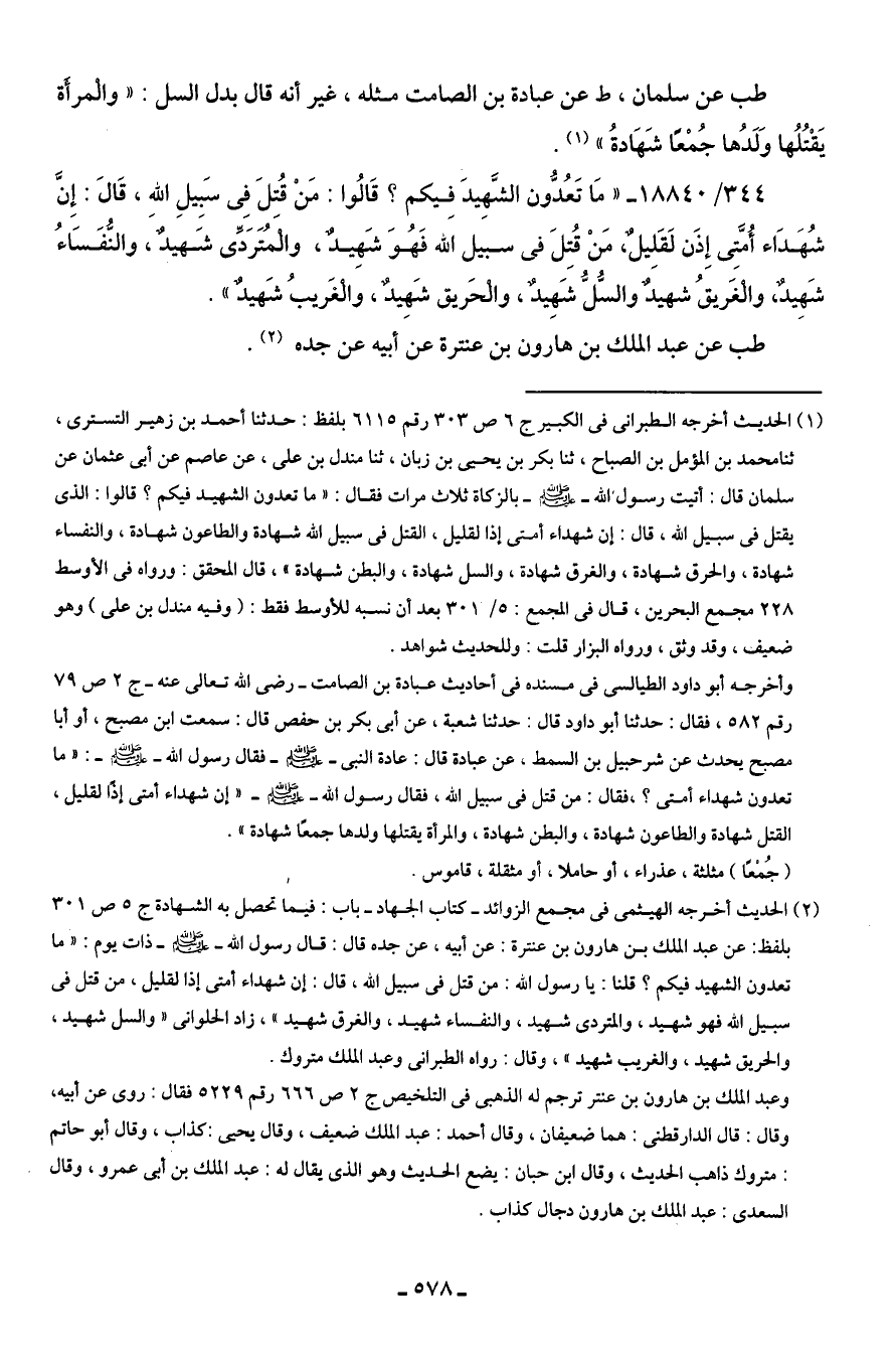 (¬2) الحديث أخرجه الهيثمي في مجمع الزوائد- كتاب الجهاد- باب: فيما تحصل به الشهادة ج 5 ص 301 بلفظ: عن عبد الملك بن هارون بن عنترة: عن أبيه، عن جده قال: قال رسول الله - صلى الله عليه وسلم - ذات يوم: "ما تعدون الشهيد فيكم؟ قلنا: يا رسول الله: من قتل في سبيل الله، قال: إن شهداء أمتى إذا لقليل، من قتل في سبيل الله فهو شهيد، والمتردى شهيد، والنفساء شهيد، والغرق شهيد"، زاد الحلوانى" والسل شهيد، والحريق شهيد، والغريب شهيد"، وقال: رواه الطبراني وعبد الملك متروك.