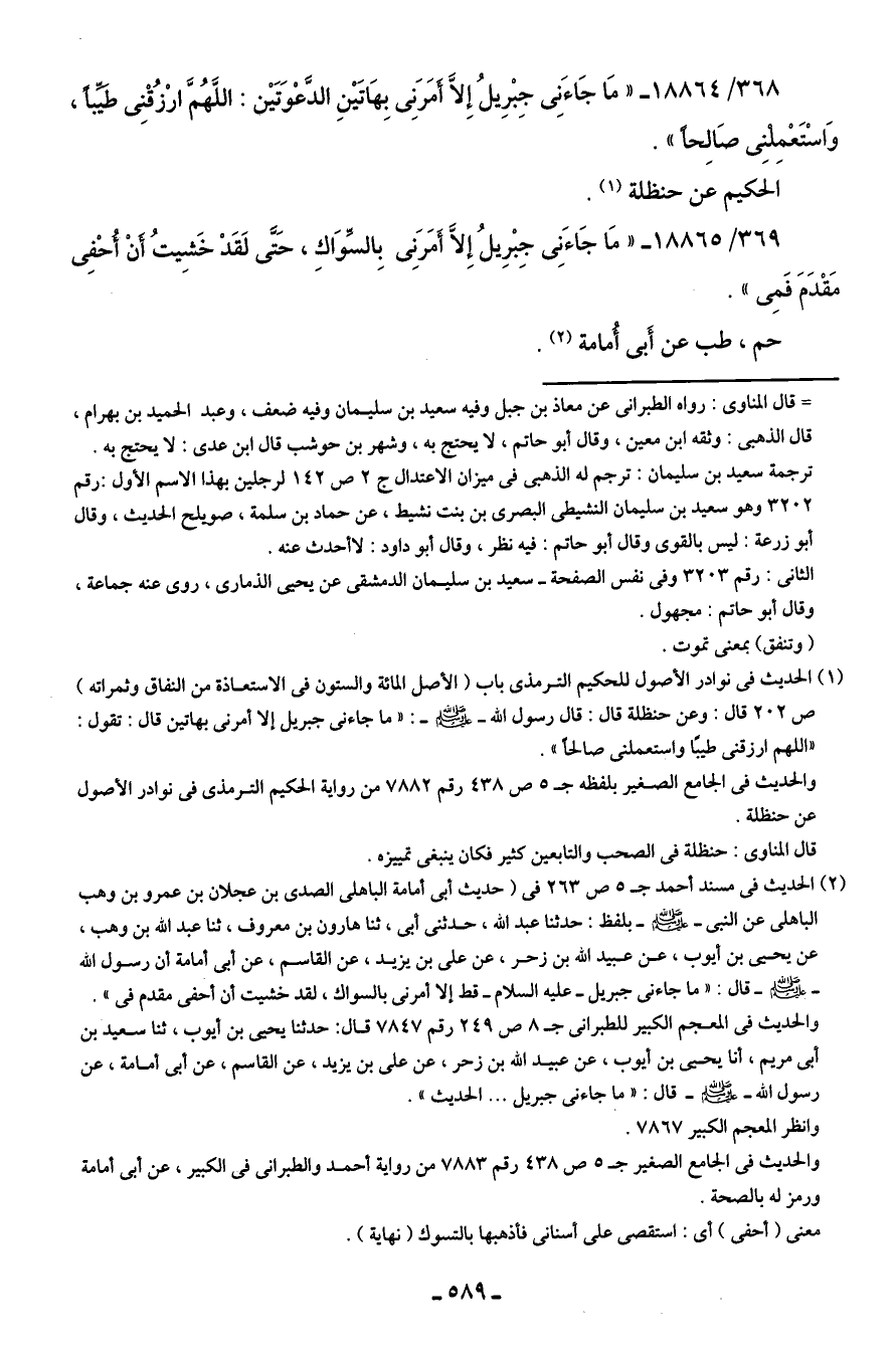 369/ 18865 - "مَا جَاءَنِى جِبْرِيلُ إِلَّا أمَرَنِى بِالسّوَاكِ، حَتَّى لَقَدْ خَشيتُ أنْ أحْفِى مَقْدَمَ فَمِى".