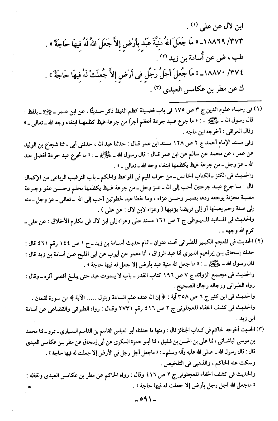 (¬2) الحديث في المعجم الكبير للطبرانى تحت عنوان- تمام حديث أسامة بن زيد- ج 1 ص 144 رقم 461 قال: حدثنا إسحاق بن إبراهيم الديري أنا عبد الرزاق، أنا معمر عن أيوب عن أبي المليح عن أسامة بن زيد قال: قال رسول الله - صلى الله عليه وسلم -: "ما جعل الله منية عبد بأرض إلا جعل له فيها حاجة".