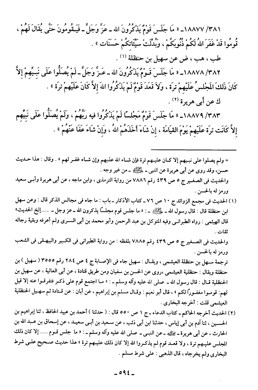 383/ 18879 - "مَا جَلَسَ قَوْمٌ مَجْلسًا لَمْ يَذْكرُوا فيه رَبَّهُمْ، وَلَمْ يُصَلوا عَلَى نَبِيّهِم إِلَّا كانَت ترَة عَلَيهِمْ يَوْمَ القيَامَة، إِنْ شَاءَ أَخَذَهُمْ اللهُ، وَإِنْ شَاءَ عَفَا عَنْهُمْ".